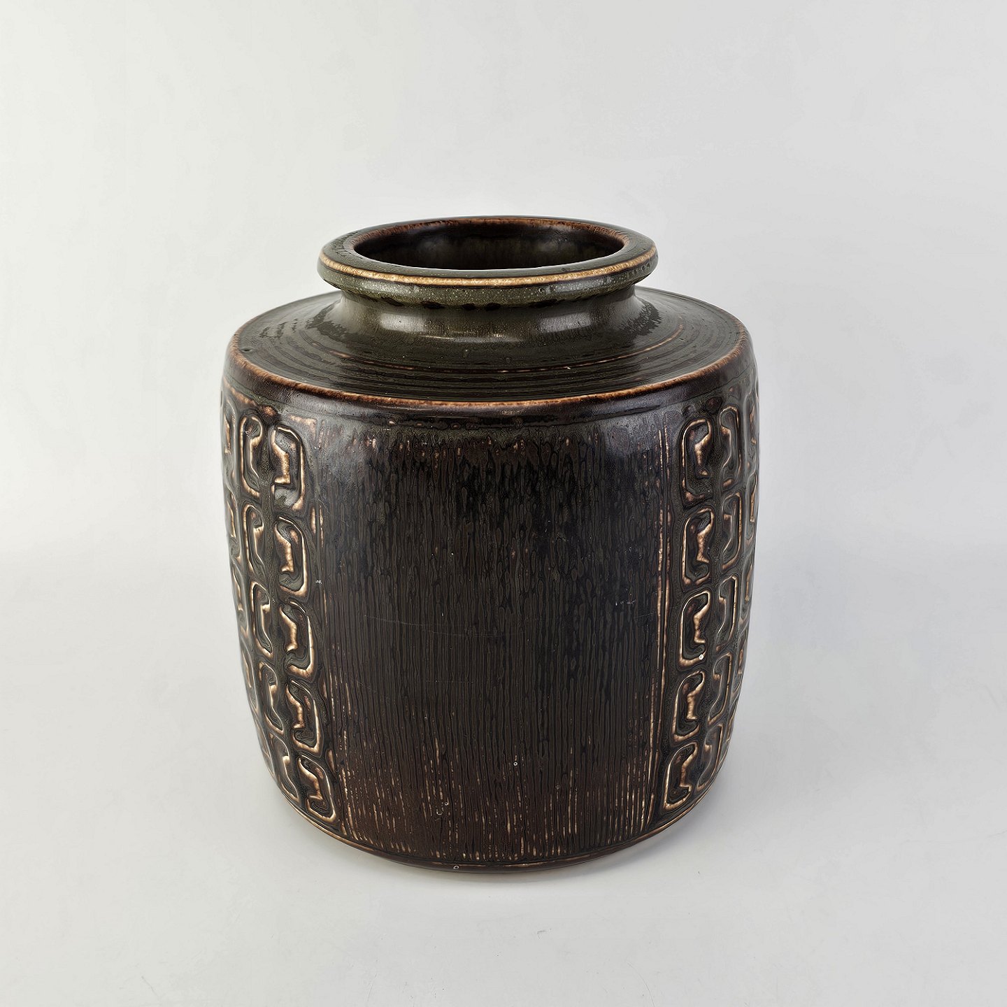 Vase i stentøj med riller og abstrakt mønster i brun glasurNr. 228