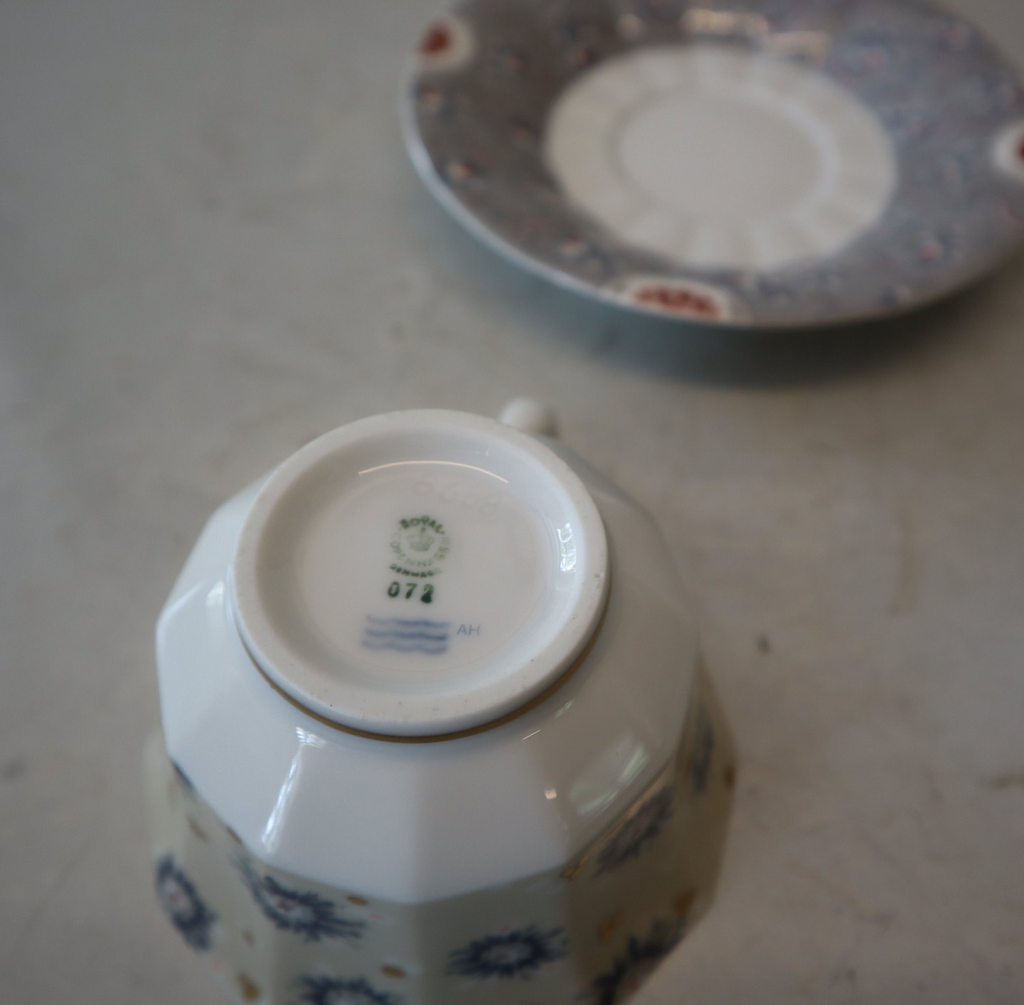 8 sæt på lager grå072 Kaffekop 15 cl og underkop 073 13,7 cm (8608) . Royal Copenhagen Fairytale. Inspireret af Gerhard Hennings figurer af samme navn. Et kompleks flerfarvet transfer mønster på den kantede form som Blå Blomst Kantet. Design Finn Næss-Schmidt og Jørgen Nielsen. De grå dele har nummer 1201, terrakotta 1202 og serveringsdele med lidt af hvert 1203.