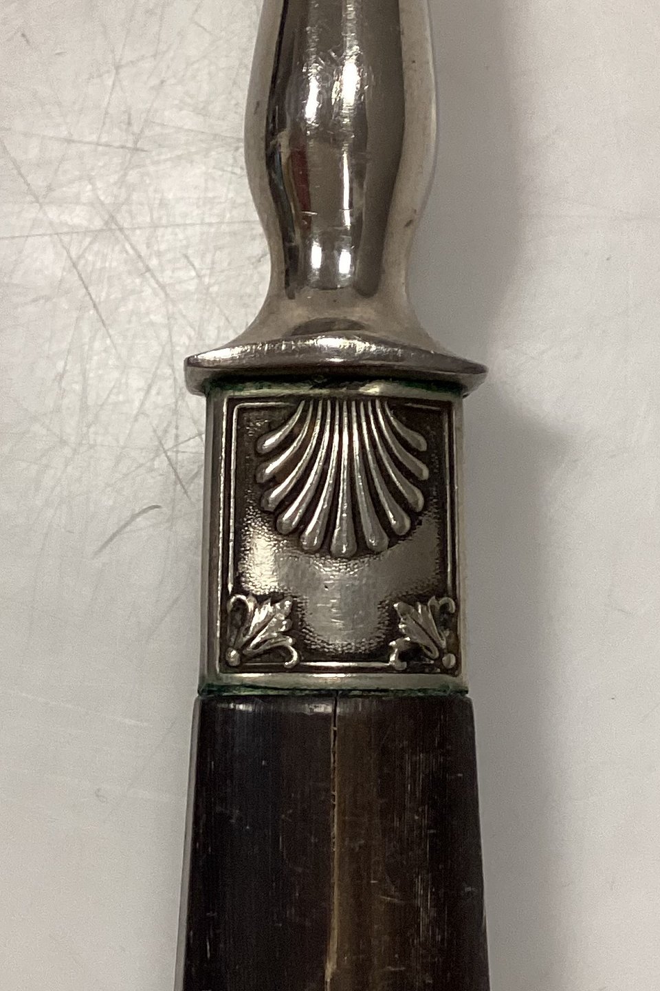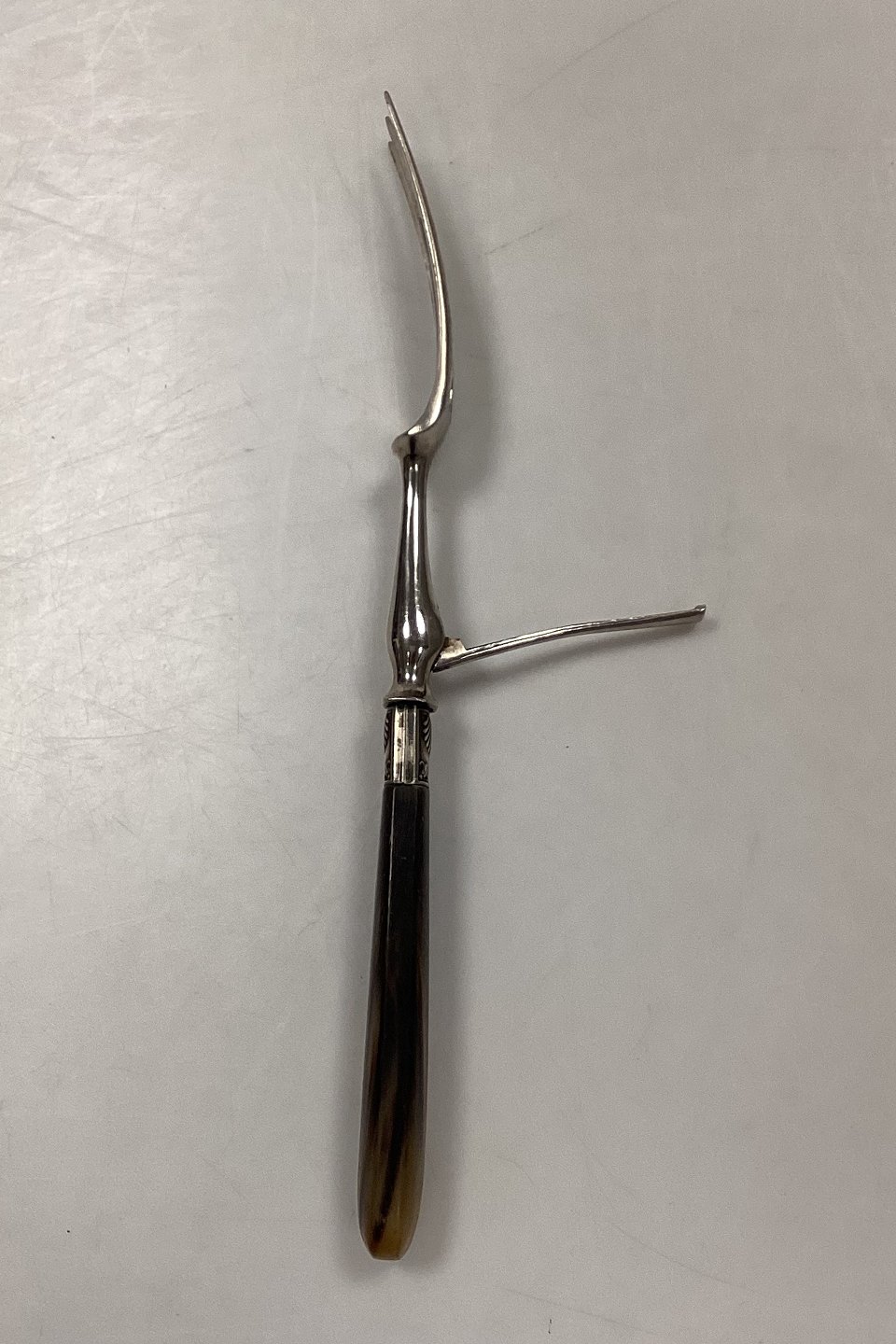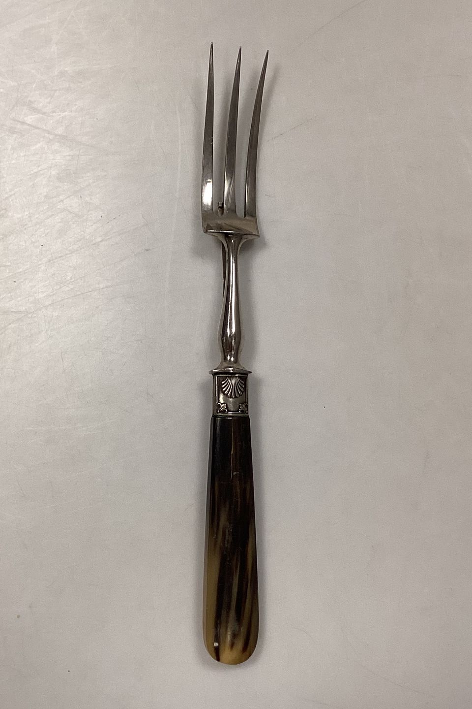 Tilquin-Anvers Rustfri Kødgaffel med lyst/brunt bakelit/plasthåndtag og muslinge motiv.Har en foldbar attrap på bagsiden. I god stand.Måler 27 cm / 10.63 inch