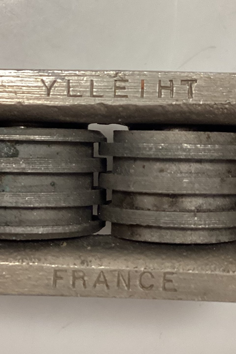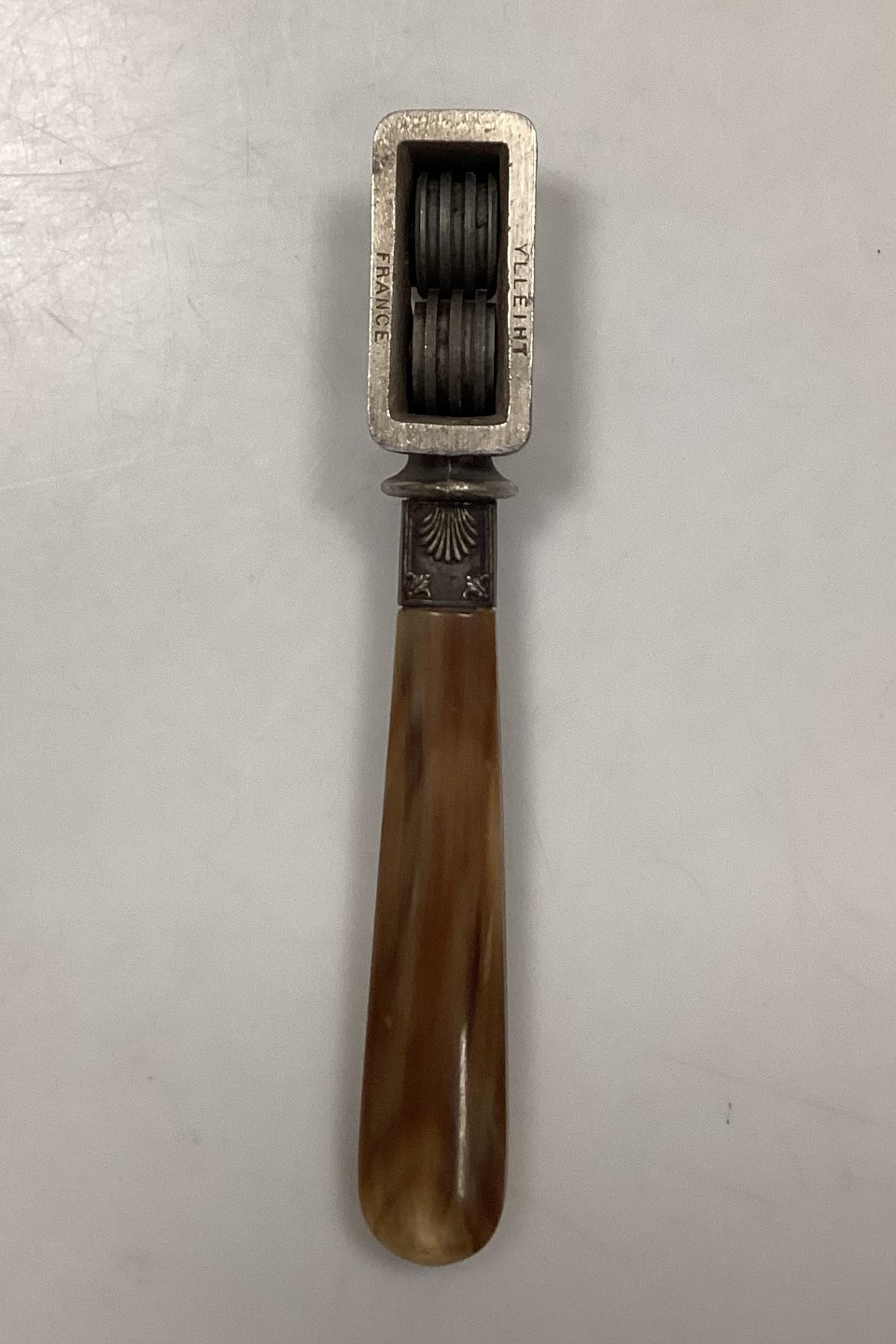 Tilquin-Anvers Rustfri Knivsliber med lyst/brunt bakelit/plasthåndtag og muslinge motiv. I god stand.Måler 16,4 cm / 6.46 inch