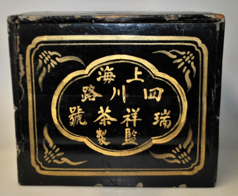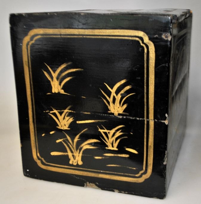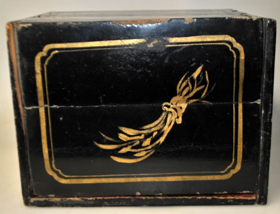 Antik bemalet trææske til te, Kina, 19. årh. Sortlakeret træ med dekorationer og tekst. 24 x 21 x 18 cm. Indvendig metal beholder med låg med tekst.Emne nummer: 28024