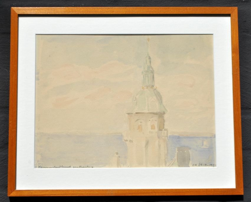 Kielberg, Ole (1911 - 1985) Danmark: Kommandanttårnet på Kronborg, 1951. Akvarel på papir. Signeret: OK 26-9-1951. H: 23,5 cm. B: 31,5 cm.Indrammet: H: 33 cm. B: 40 cm.