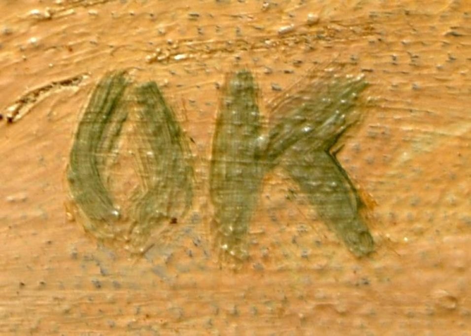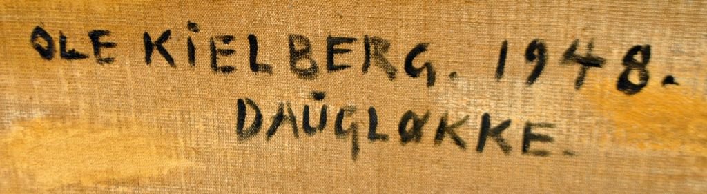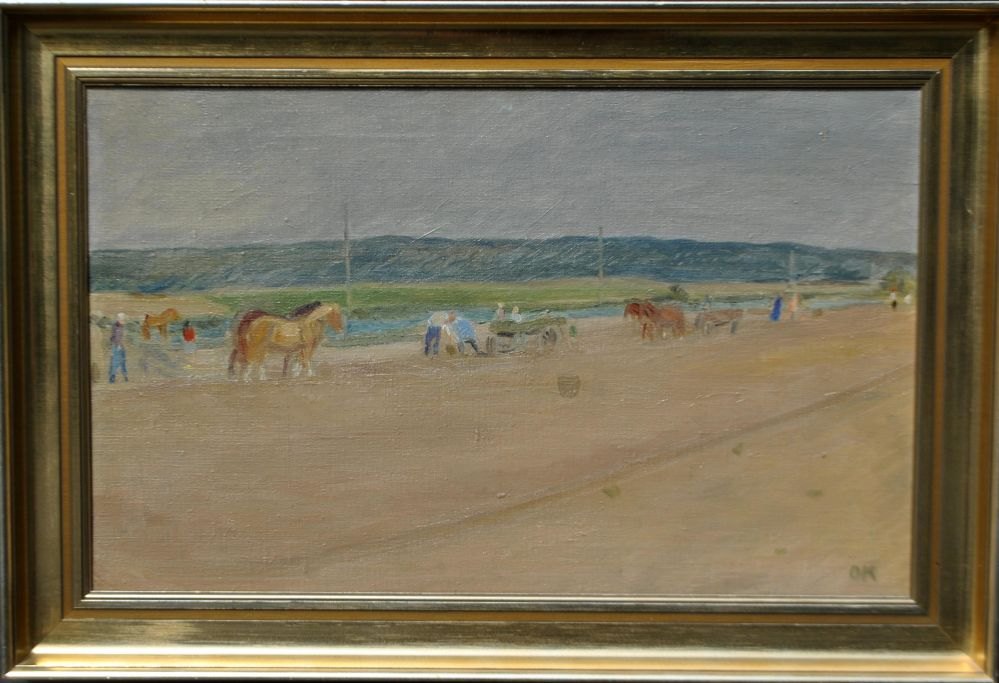 Kielberg, Ole (1911 - 1985) Danmark: Pløjning, 1948. Olie på lærred. Signeret: OK og bagpå: Ole Kielberg Daugløkke 1948. H: 38 cm. B: 61 cm.Indrammet: H: 48,5 cm. B: 71,5 cm.