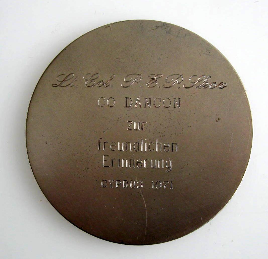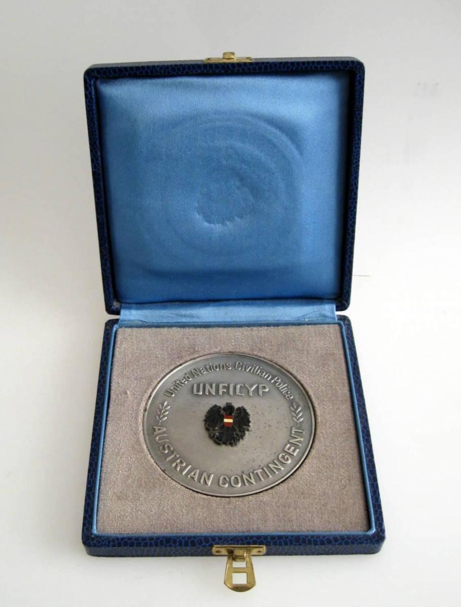 FN medalje - United Nations Civilian Police - Unficyp. Austrian Contingent. Dia.: 7,5 cm. Metal med emalje. Med inskription.: Lt. Col. P.E.P. Skov CO DANCON zur freundlichen Erinnerung, CYPRUS 1971. I orignial æske. Proveniens: Oberstløjtnant Poul Ervin O. Skov, Øverstkommanderende Dancon XIV, Cypern.Emne nummer: 5425
