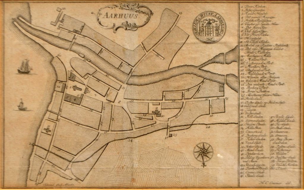 Topografisk kort over Aarhus, 1767. Danmark. Kobberstik. H. C. Cramer. 20 x 32 cm.Indrammet: 35 x 47 cm.