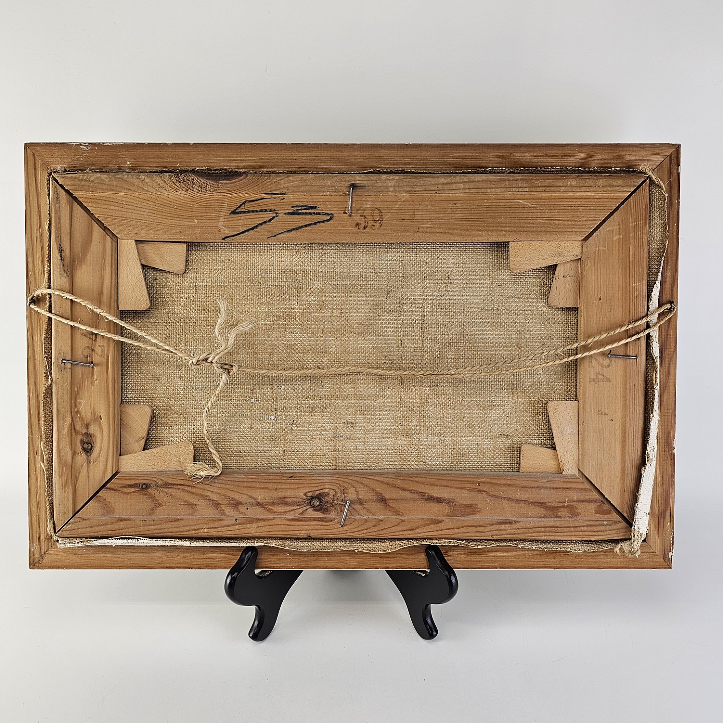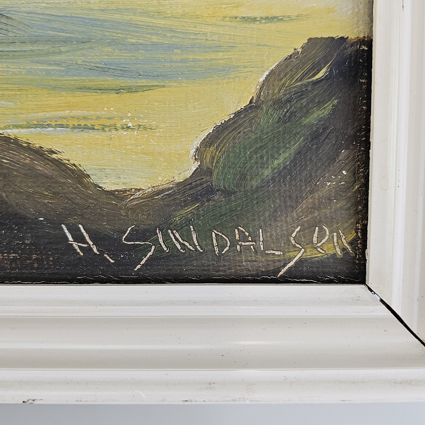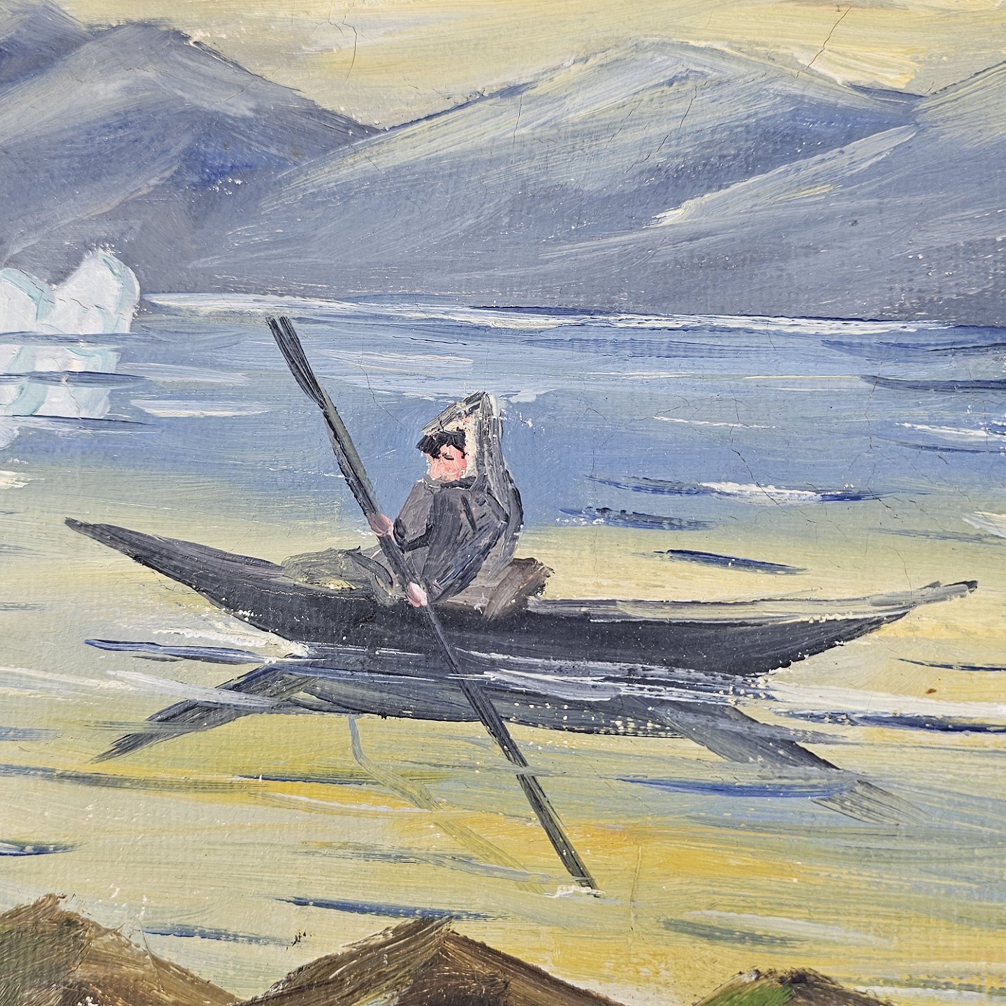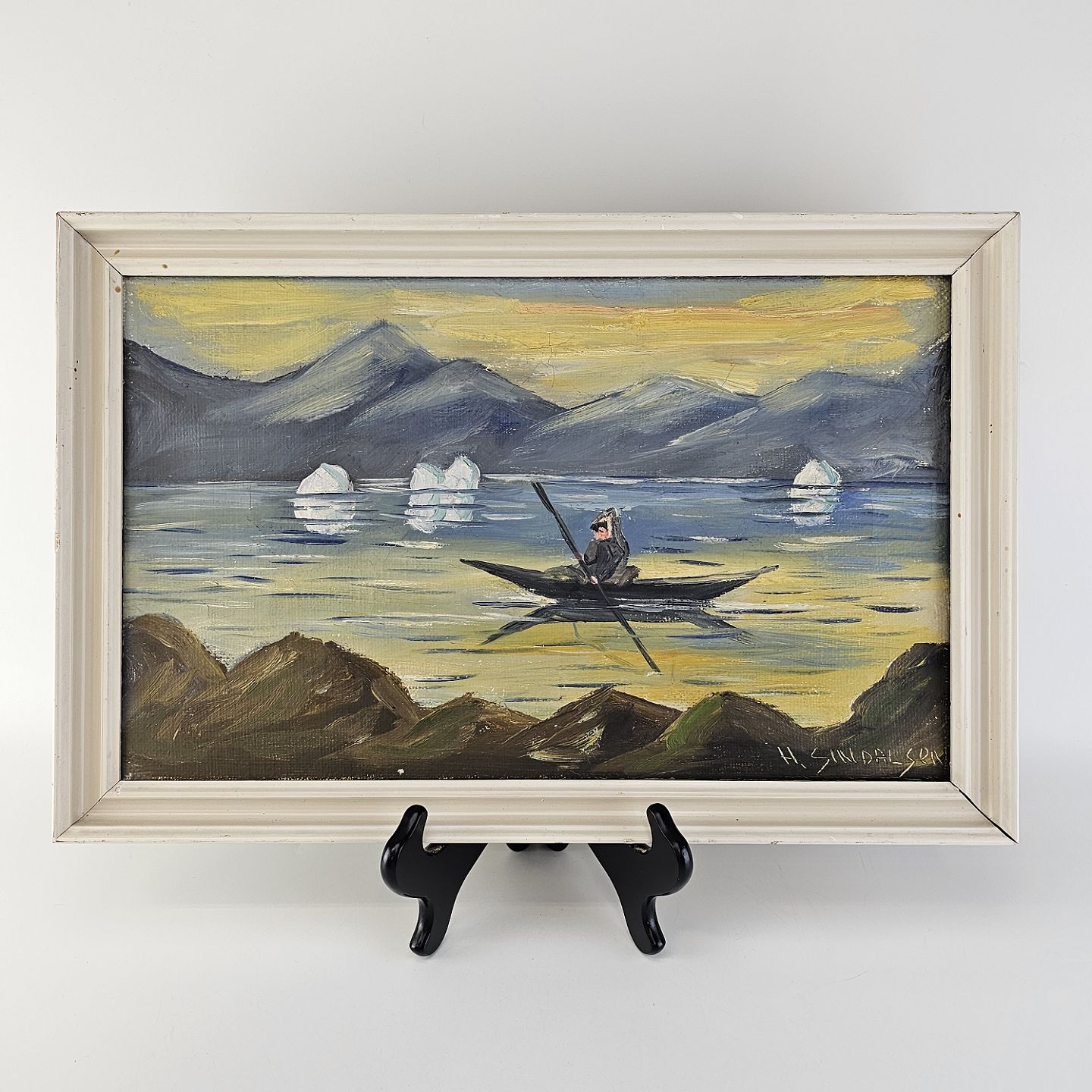 Oliemaleri på lærred i hvidmalet træramme. Havmaleri med et grønlandsk inspireret motiv af en kajaksejlerKunstner H. Sindalsen