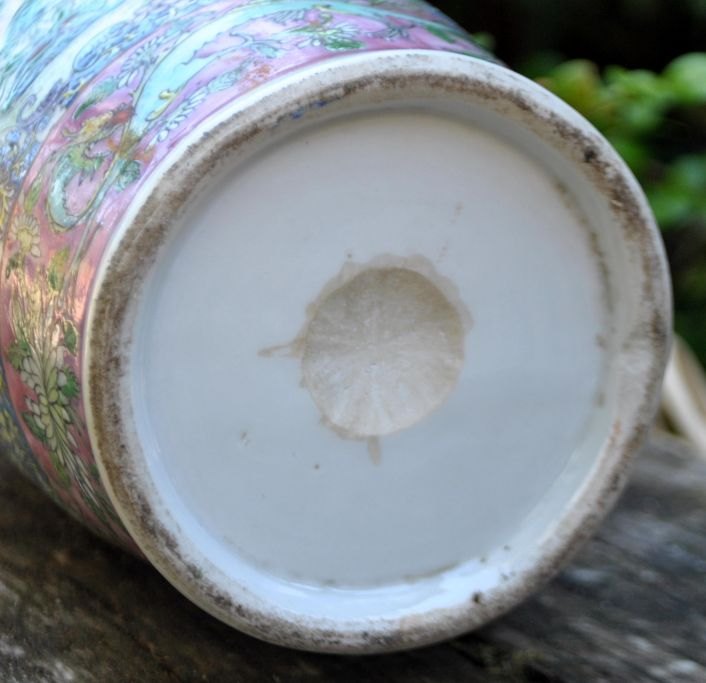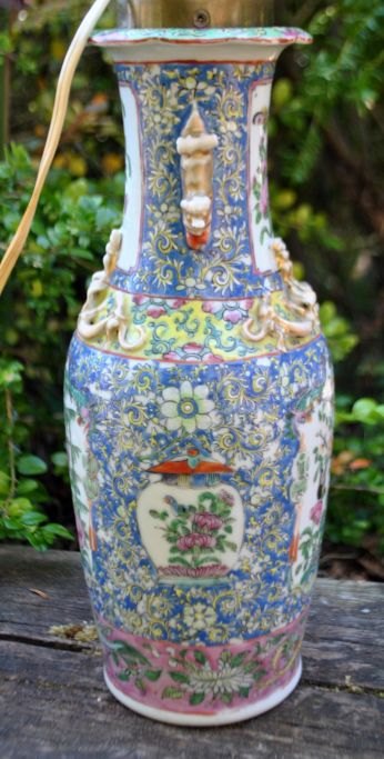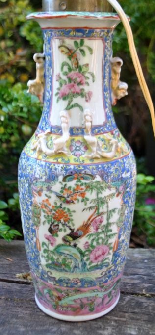 Kinesisk vase - omgjort til lampe, 19. årh. Famille rose. Dekoration i form af løver, drager, fugle og blomster. Højde: 30 cm. Højde med montering: 54 cm.Emne nummer: 28218