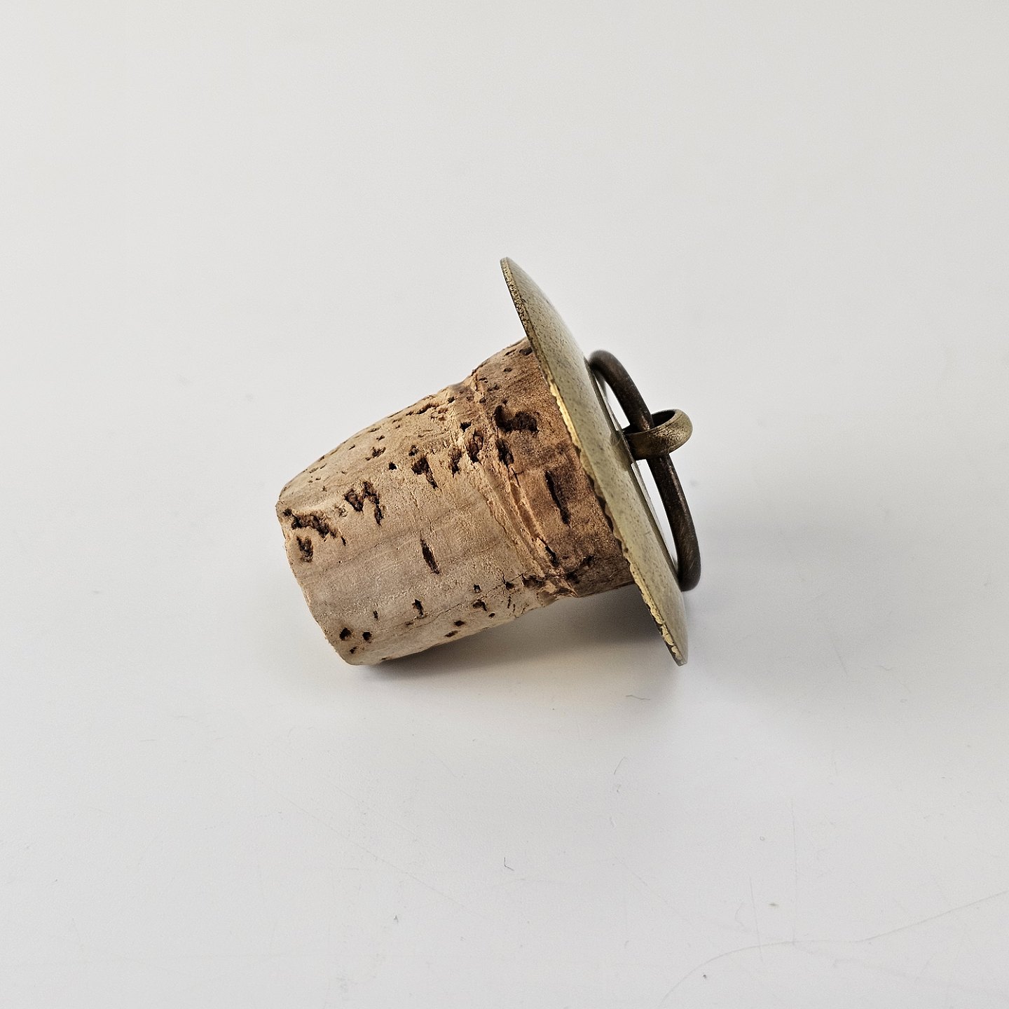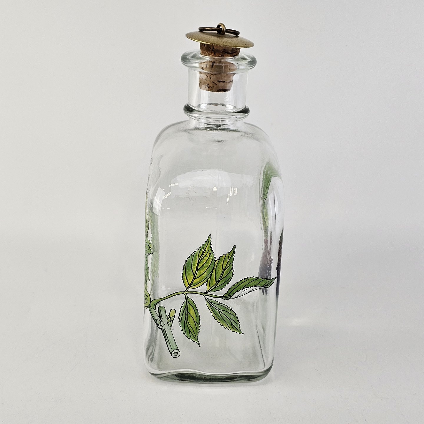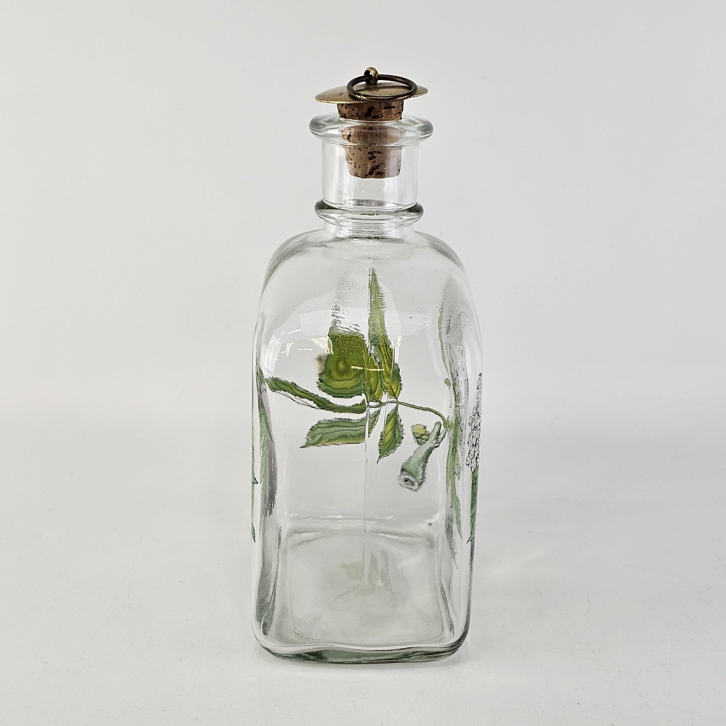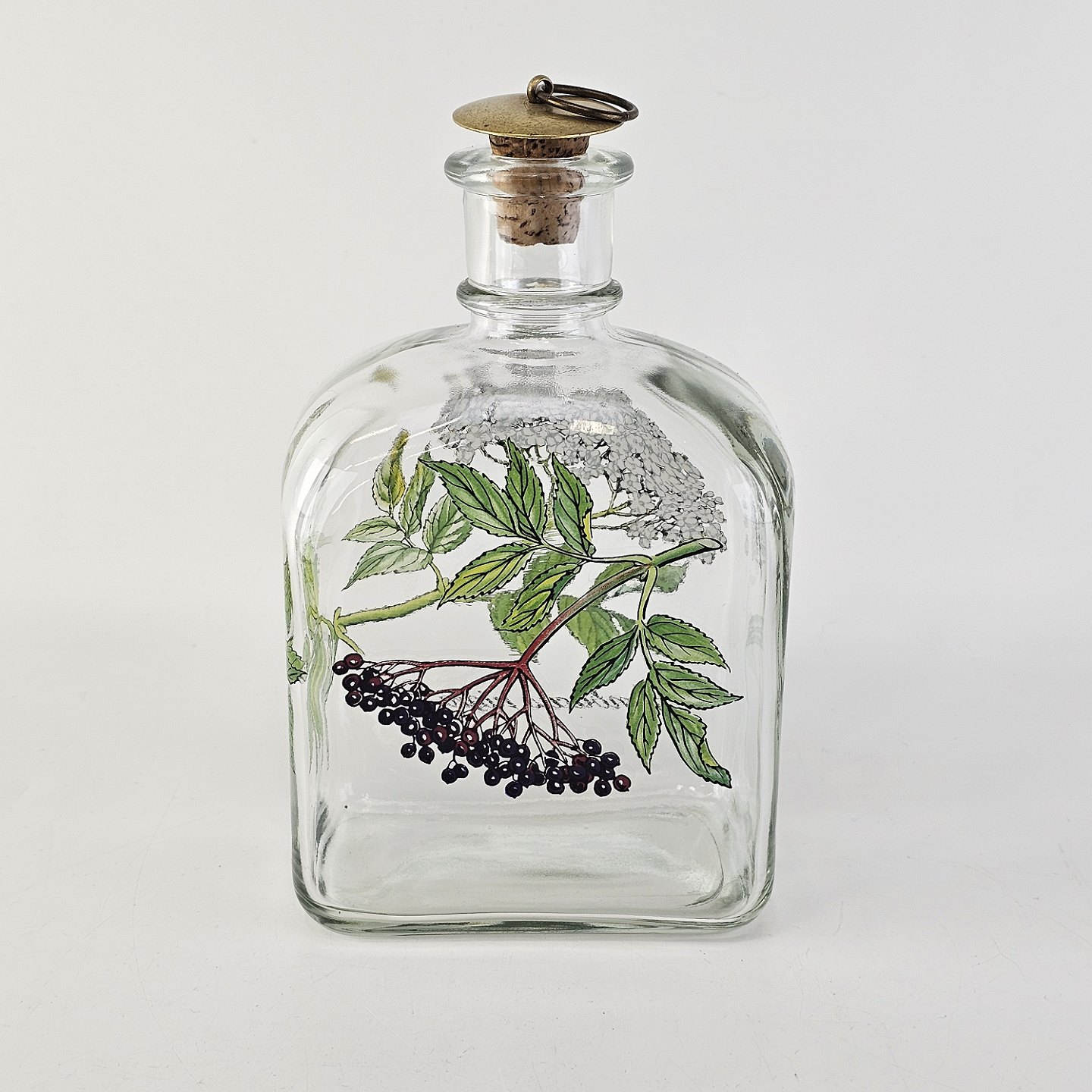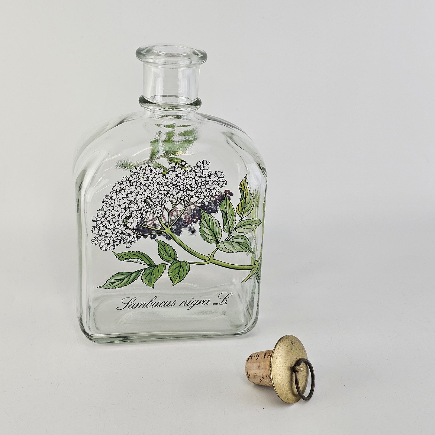 Karaffel i klart glas med korkprop fra serien Brændevins Amatøren, dekoreret med en gren af hyldeblomst og teksten Sambucus Nigra L.Formgiver Finn Clausen / Michael Bang