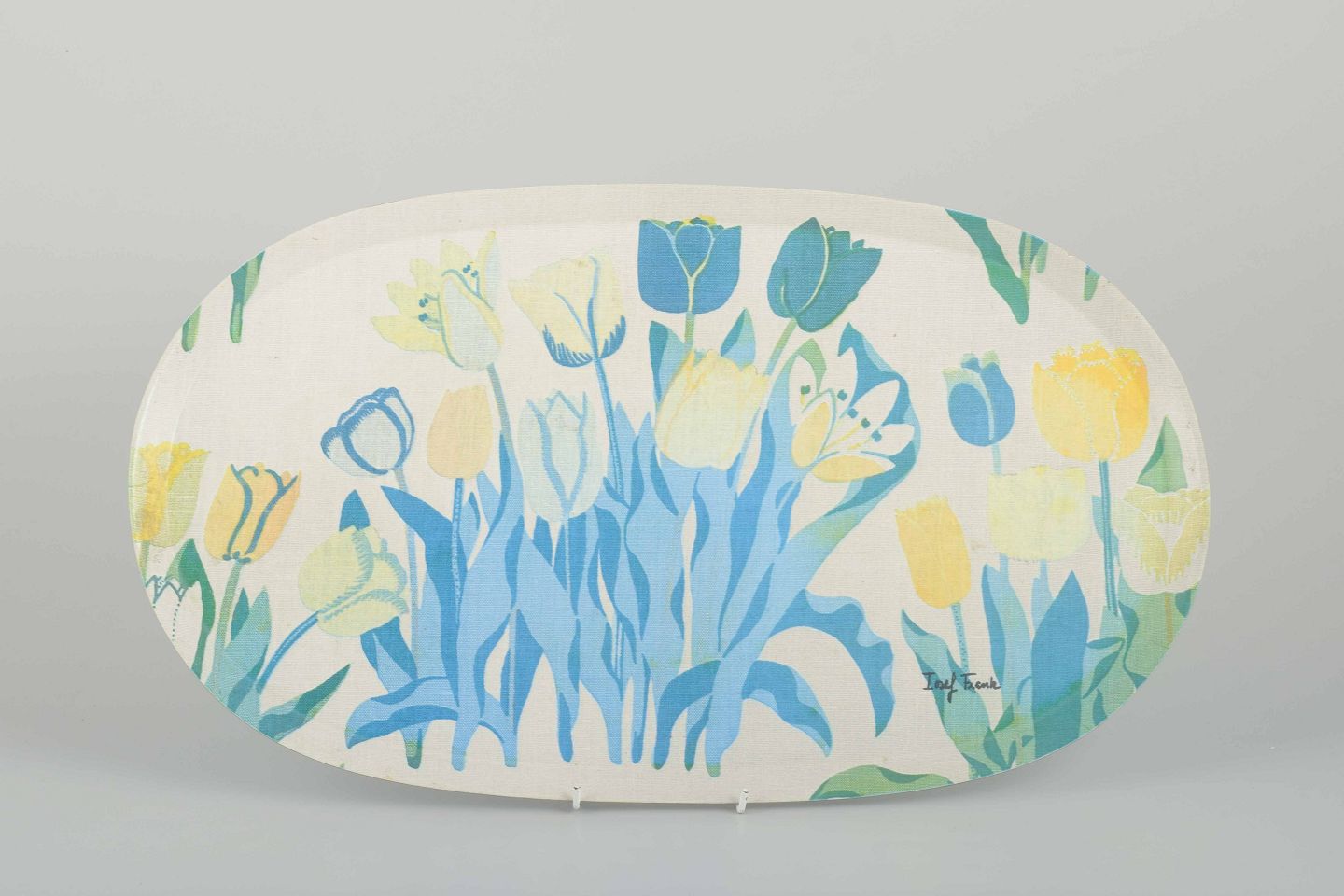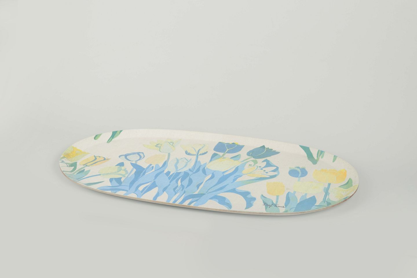 Oval serveringsbakke i formpresset træ med pålimet laminat. Dekoreret med Josef Franks ikoniske blomstermotiv i blå, grønne og gule nuancer.