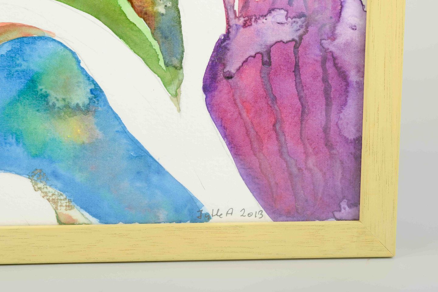An abstract and colorful work in watercolor, where organic forms in violet, blue, and green tones float across the white surface of the paper. The work appears as a free and experimental composition with both figurative and nature-inspired associations.