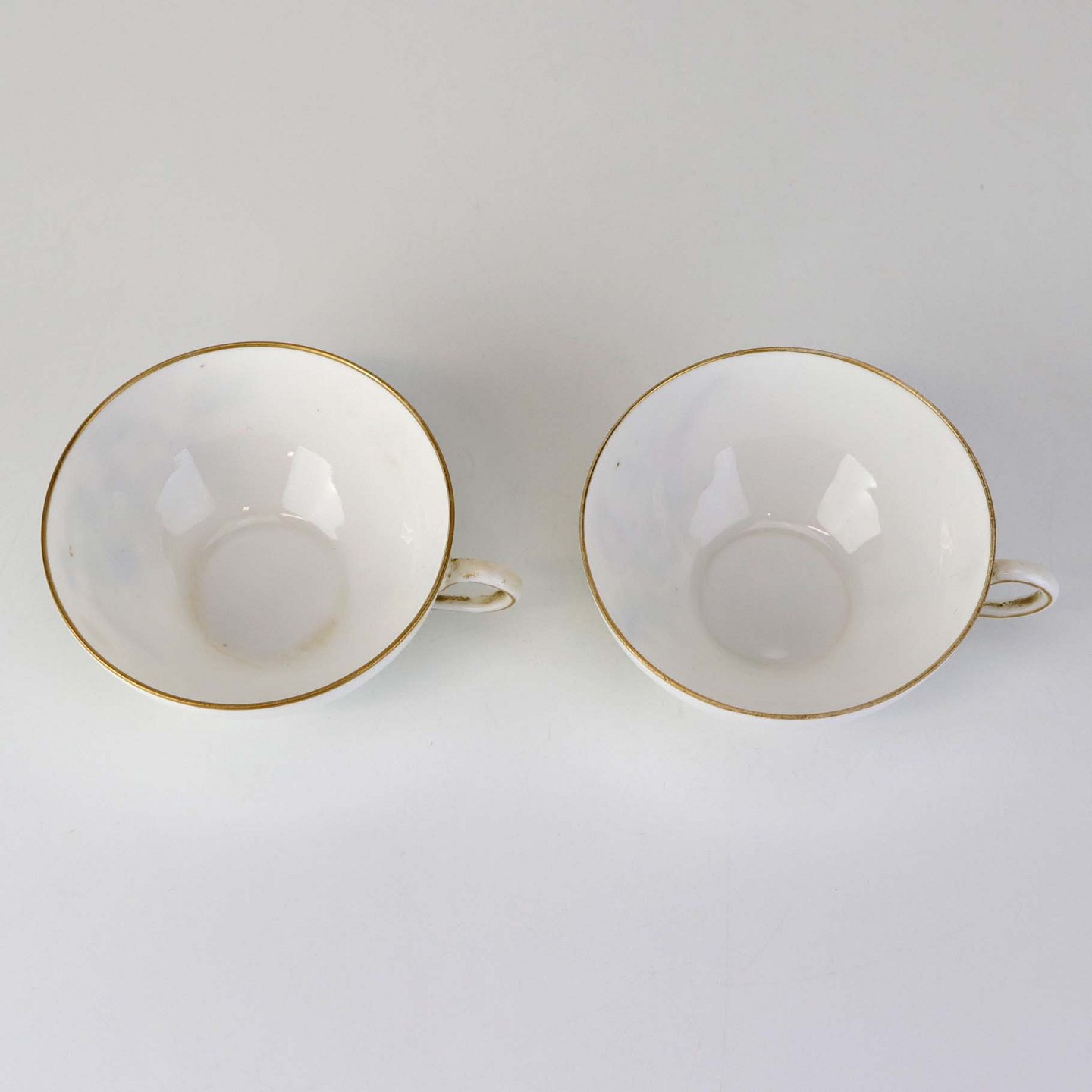 Sæt med fem styk kaffekopper og tre styk underkopper i porcelæn med håndmalede blomstermotiver og guldkant. Stellet fra ca 1850.Producent Royal Copenhagen