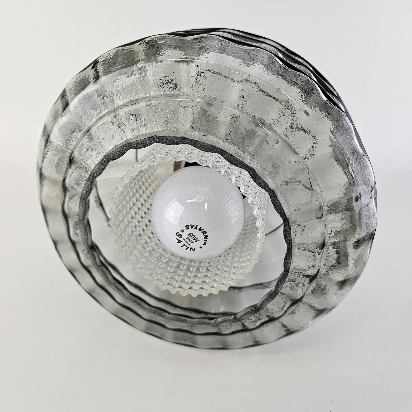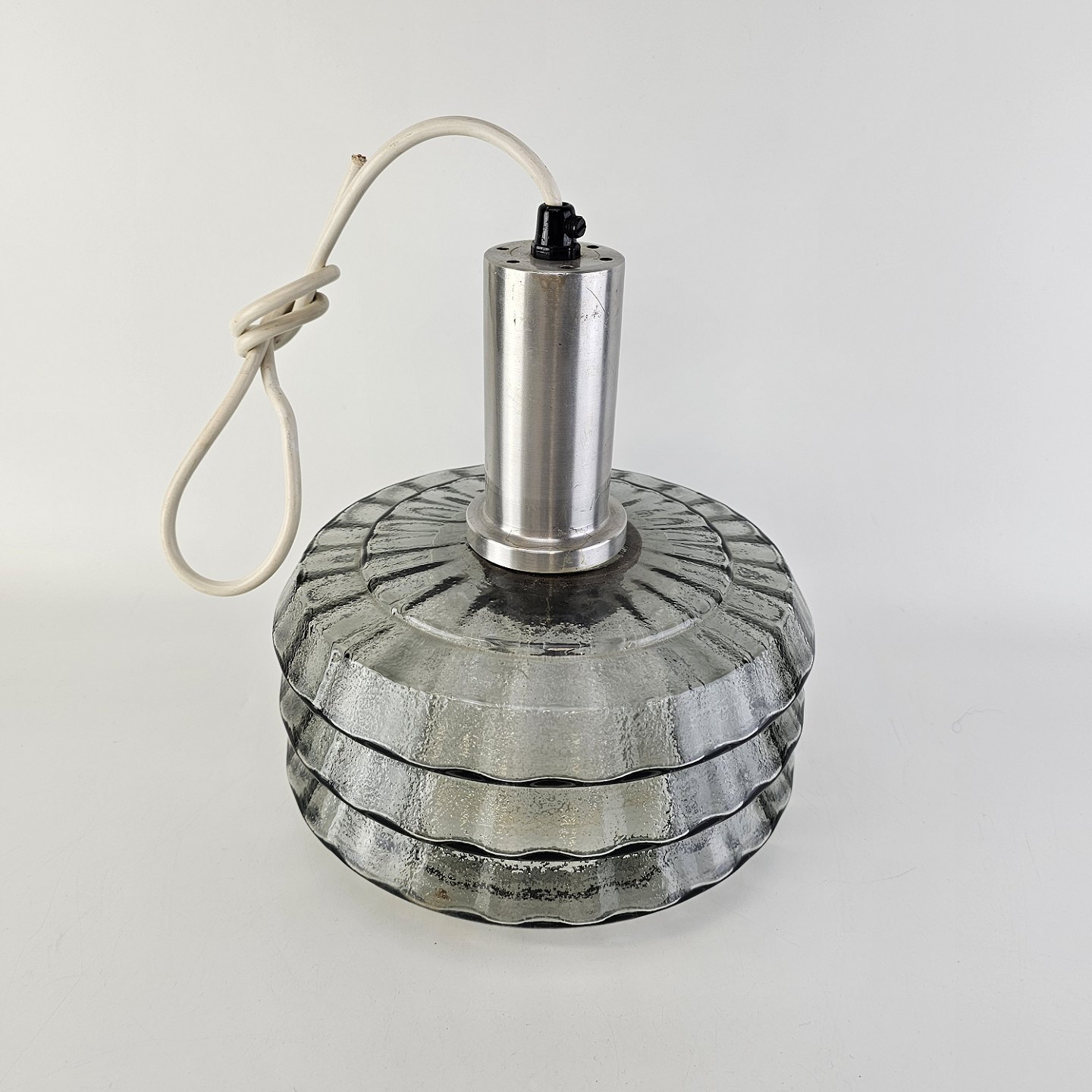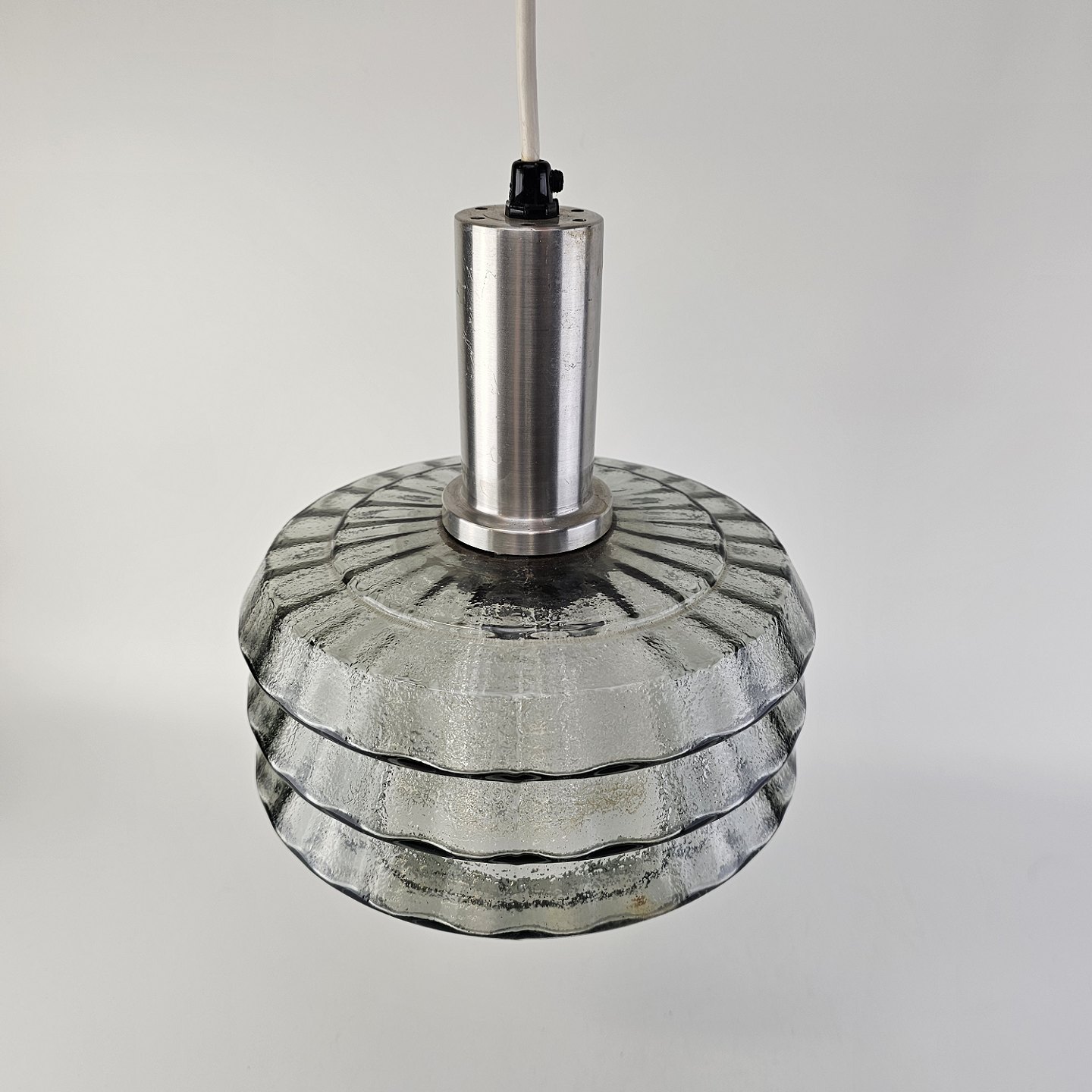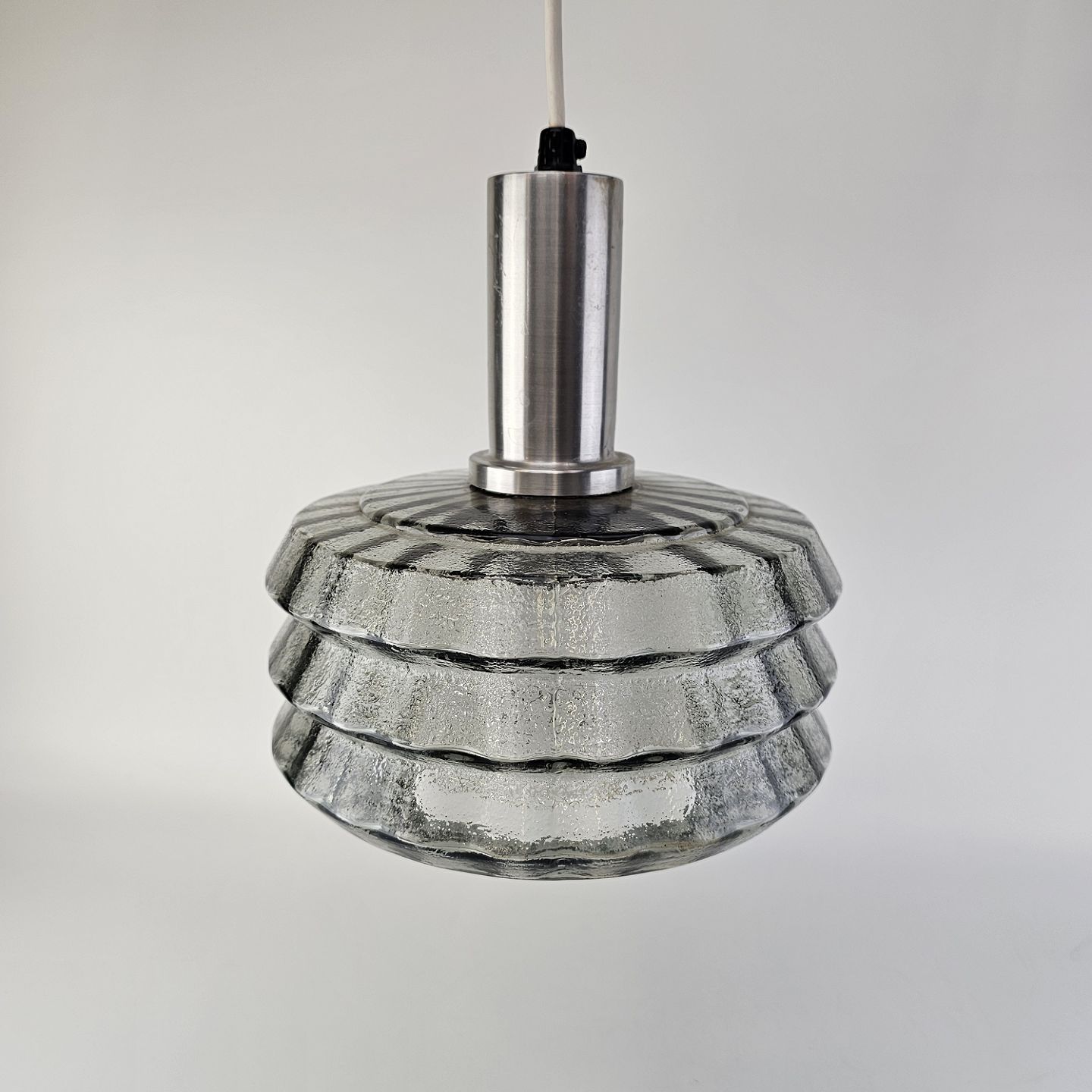Pendel med skærm i grå-farvet glas i bølget mønster i tre lag.Højde 22 cm