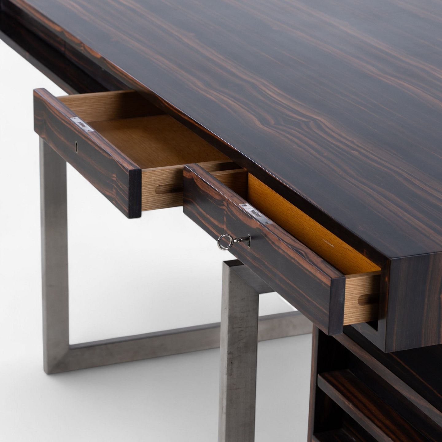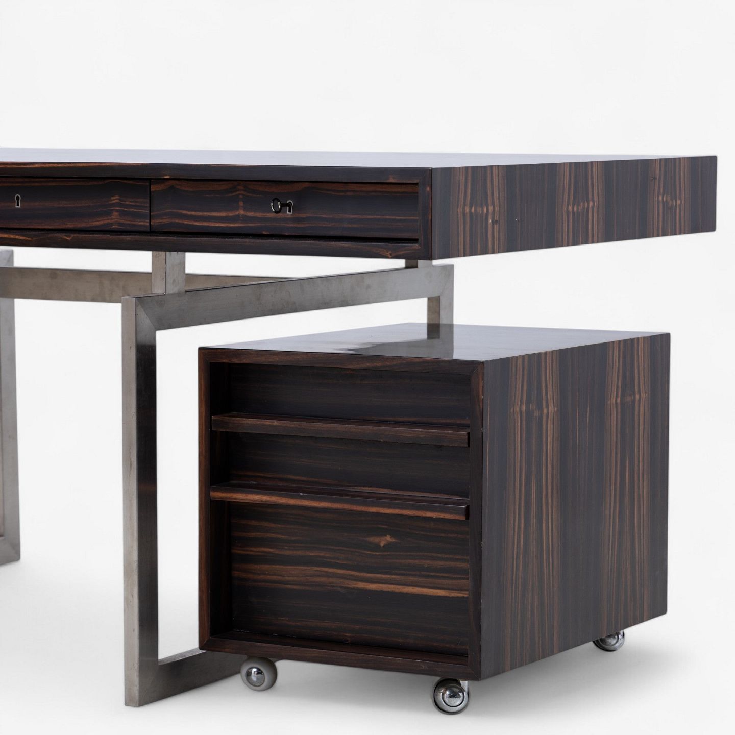 Skrivebord i valnød med fire skuffer, skuffemodul på hjul og stel i stål.