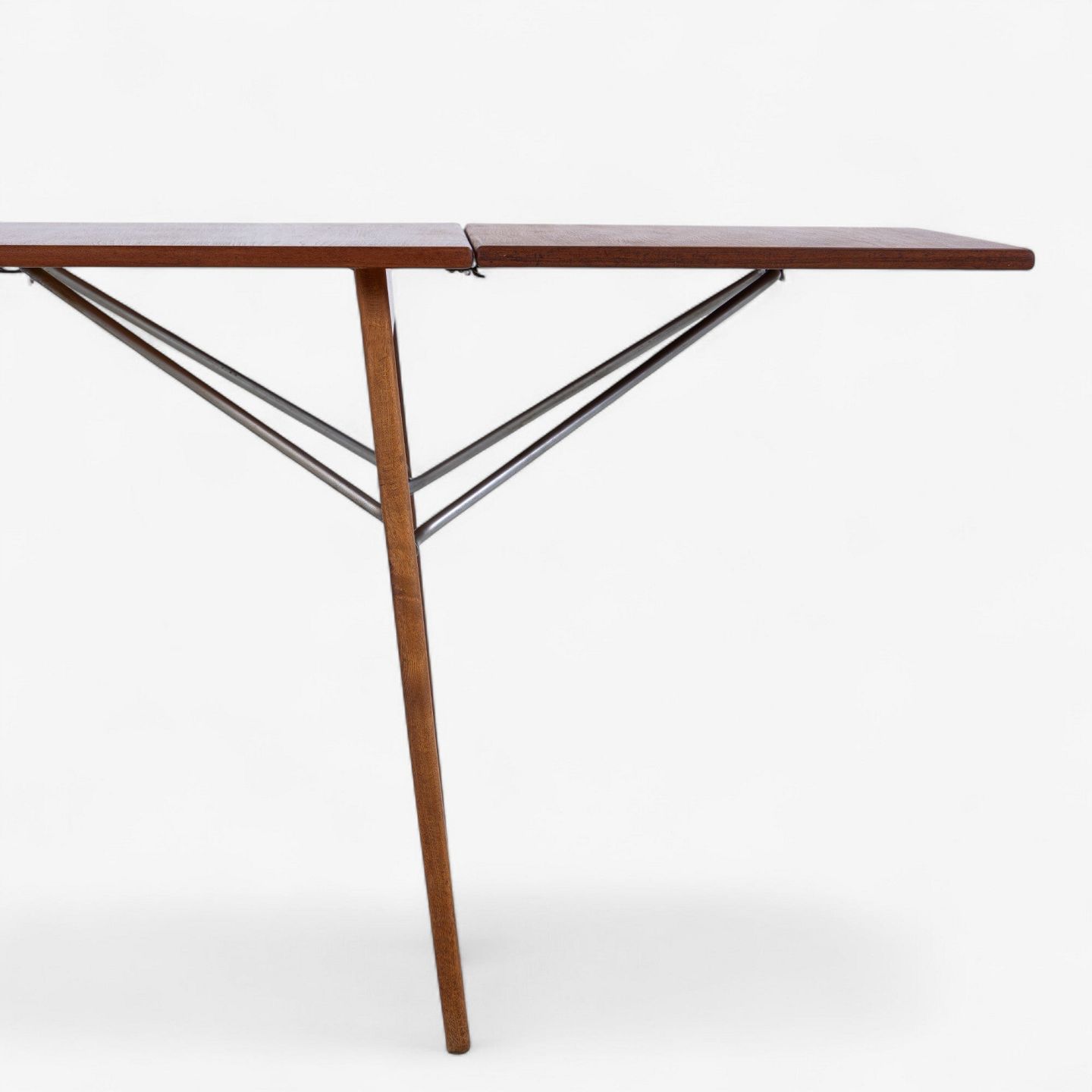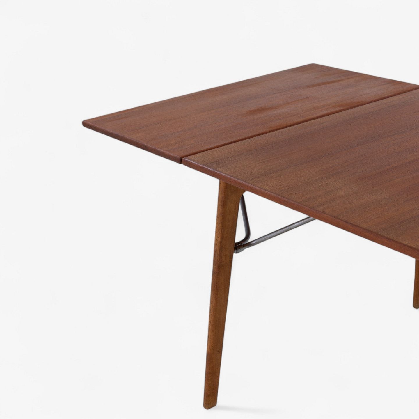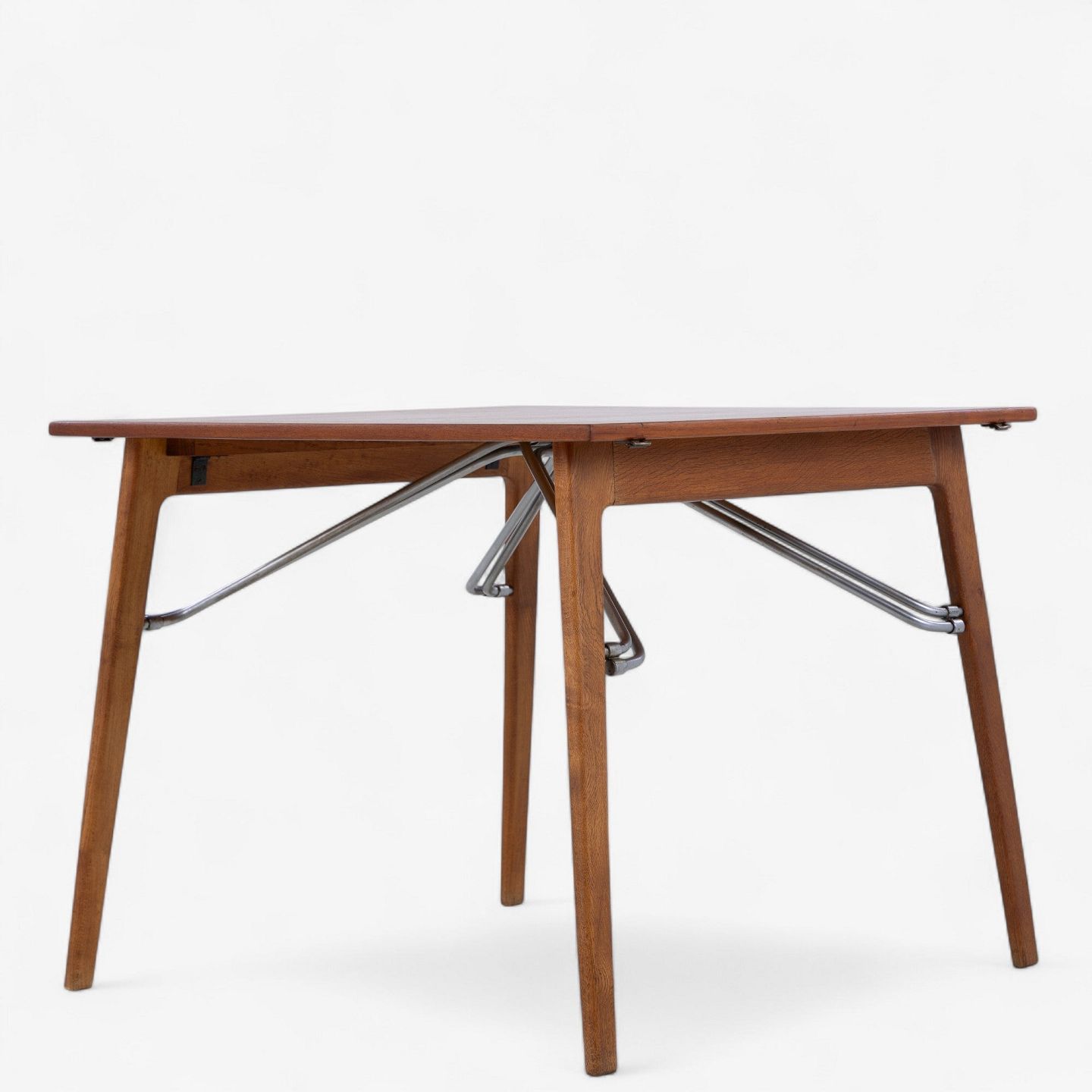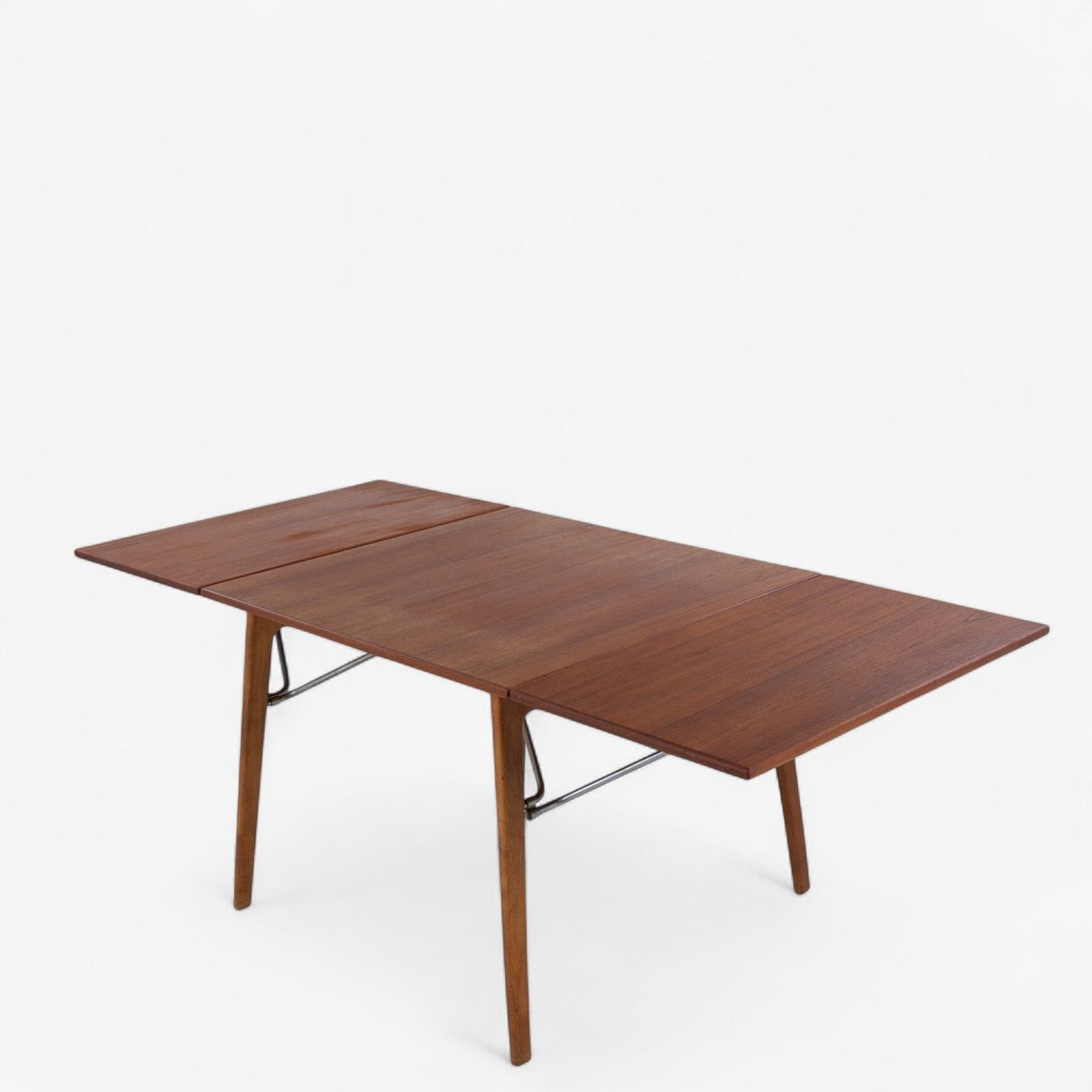 Spisebord med stel i massiv egetræ og top i teak med to tillægsplader.