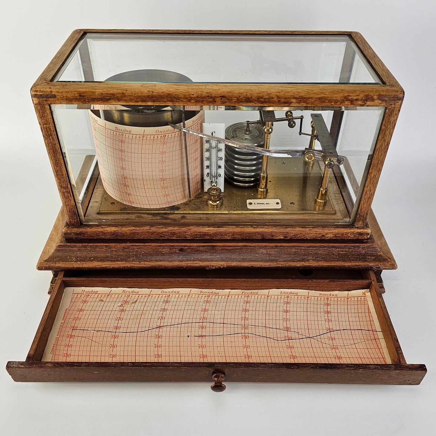Barograf i kasse af træ og glas, med en skuffe i bundenMærkat med C. Horman, Aalborg, delvist skrabet af