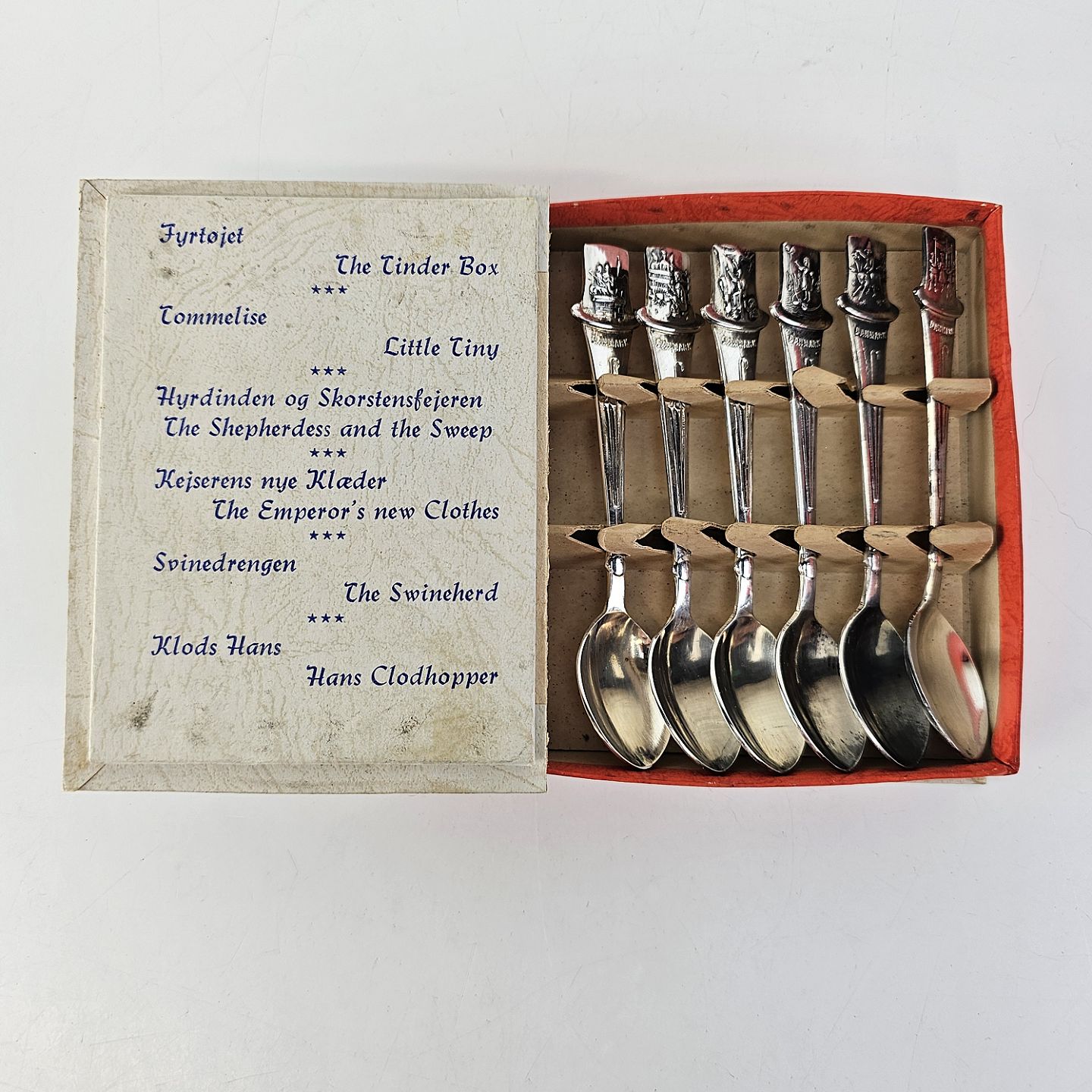 En lille bog med seks pletsølvskeer, alle med forskellige motiver fra H. C. Andersens eventyrFyrtøjet, Tommelise, Hyrdinden og Skorstensfejeren, Kejserens Nye Klæder, Svinedrengen og Klodshans