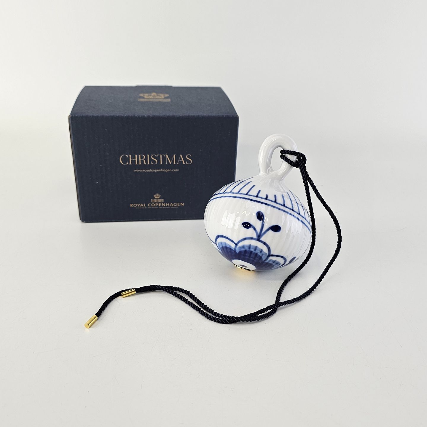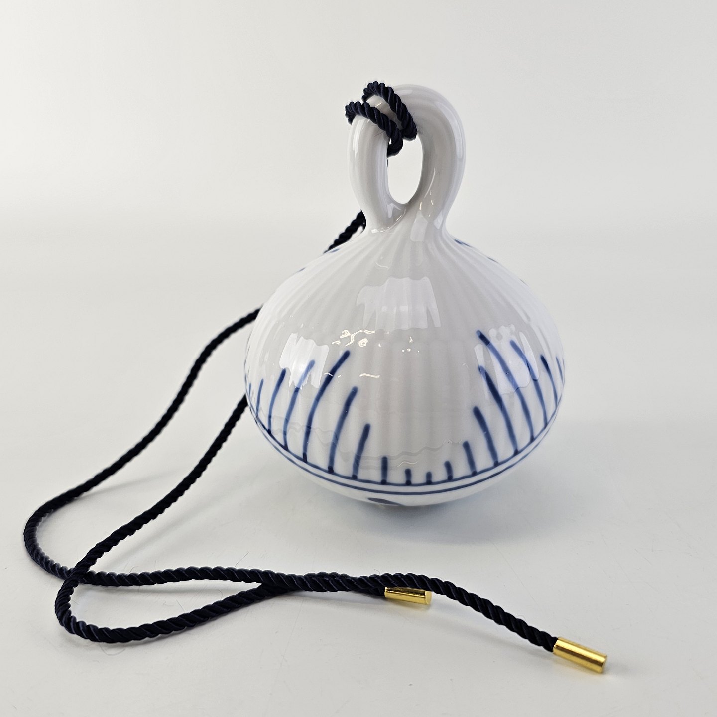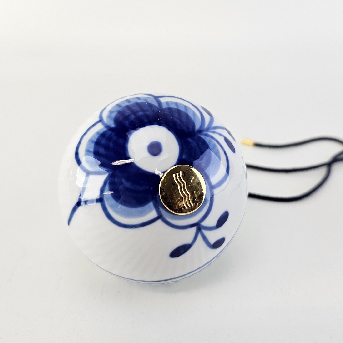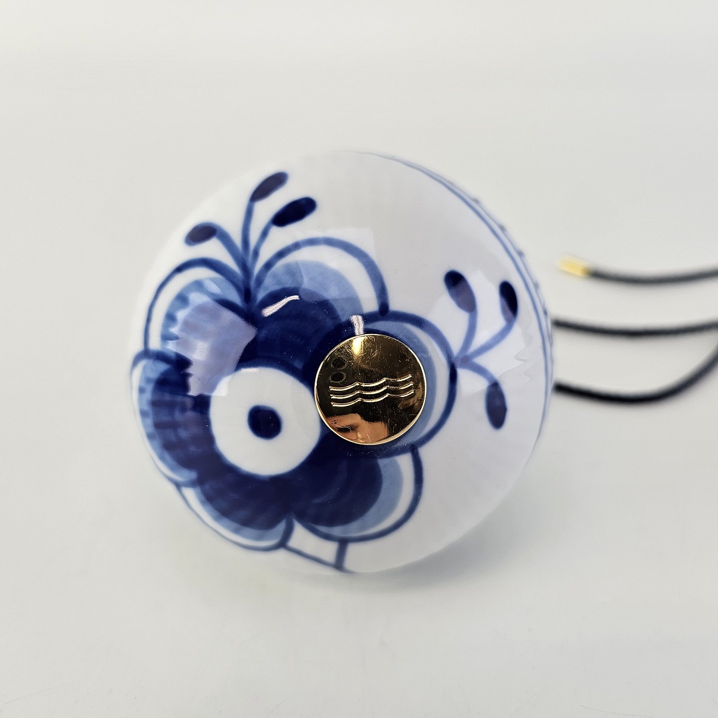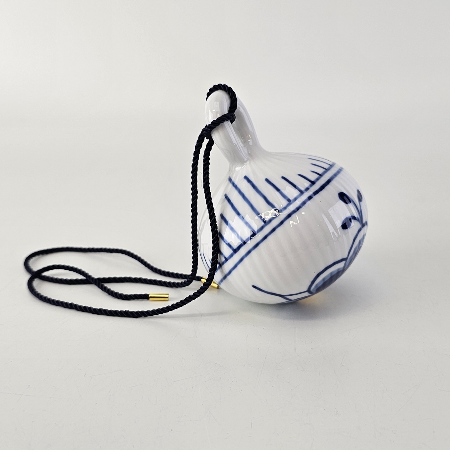 Julekugle af porcelæn med blå mega riflet musselmalet mønsterHåndmalede