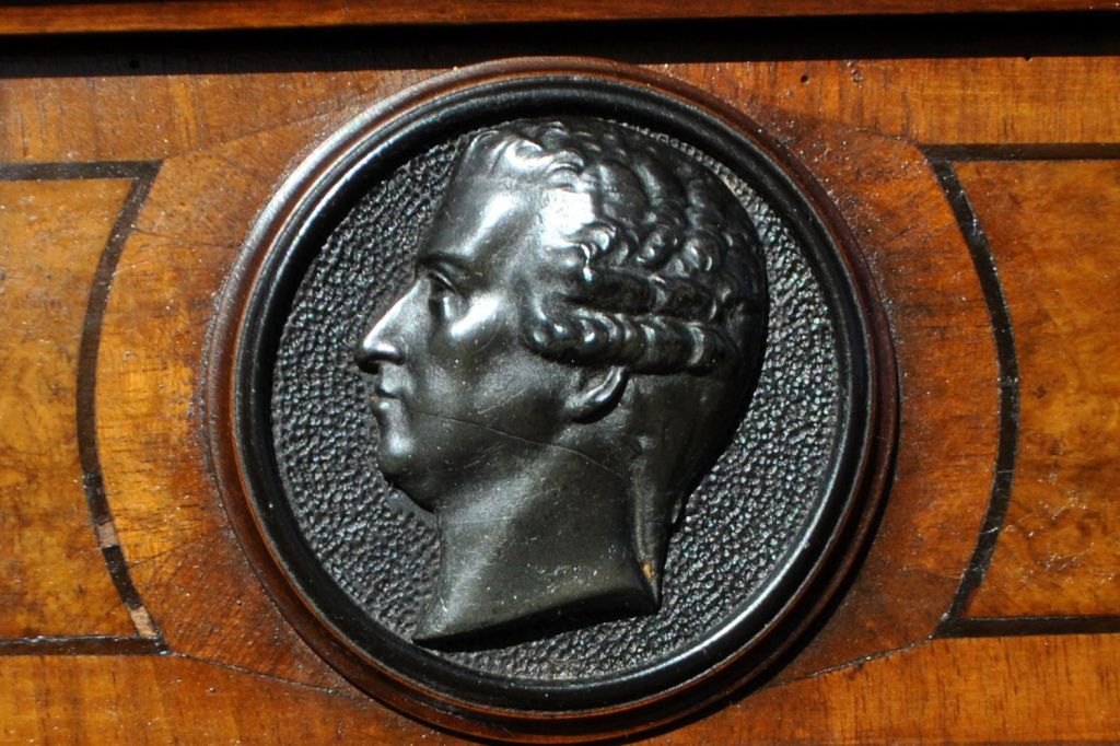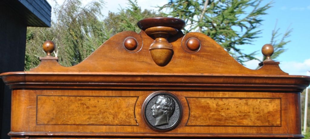 Dansk bogskab, ca. 1860 - 80. Valnøddetræ og fineret valnødderod. Front med låge og to glas. Indvendig med flytbare hylder. Øverst medaljon med ansigt i profil. Top med drejede kugler. H.: 180 cm. D.: 34 cm. B.: 78 cm.Emne nummer: 28247