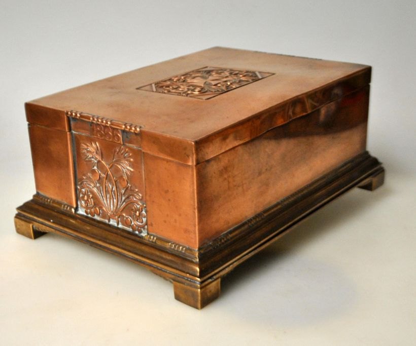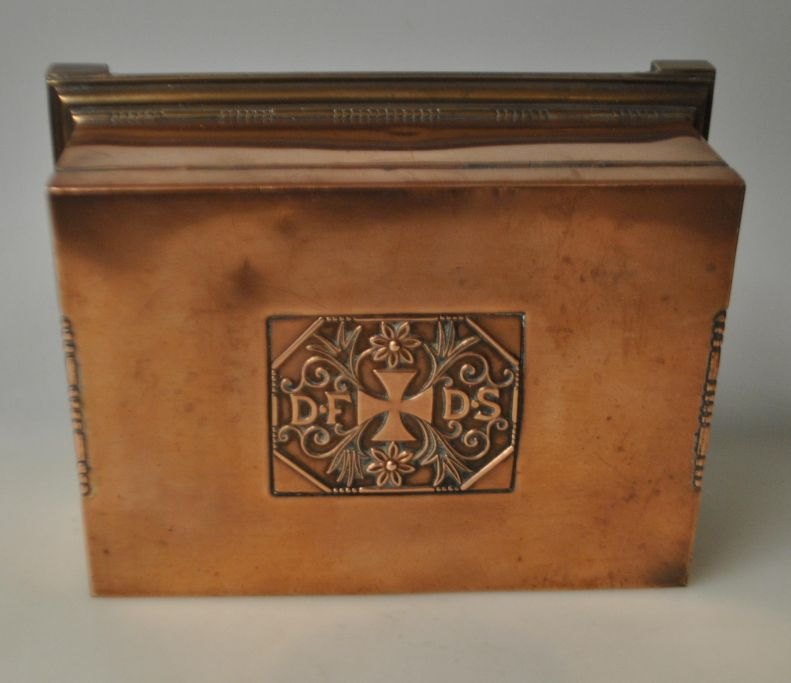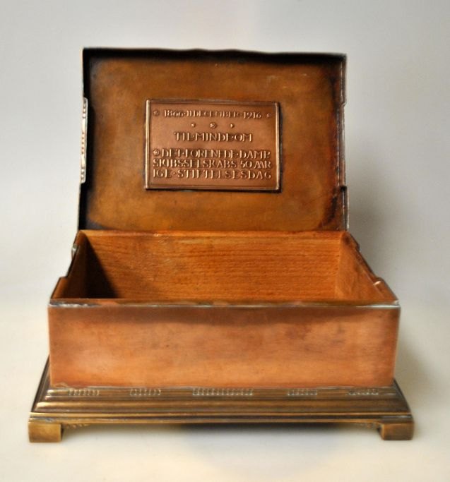 DFDS cigarskrin af kobber og messing, indvendig med træ. 1916. Johan Rohde for Georg Jensen. Præget med skønvirkemotiver og DFDS 1866-1916. Indvendig plakette: Til Minde Om Det Forenede Dampskibsselskabs 50 Aarige Stiftelsesdag. H. 8,5 B. 19 D. 14. cm.Fremstår med brugsspor i form af enkelte tryk og ridser.<br />Skrinet blev fremstillet i kobber, sølv og ét eksemplar i guld til kong Christian X.