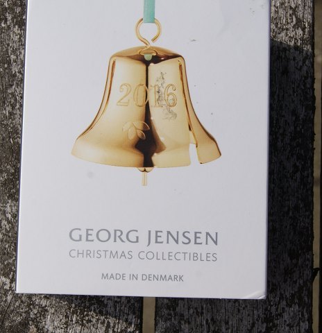 Georg Jensen julepynt i forgyldt messing. Georg Jensen Juleornamenter.Juleklokke fra 2016 i original æske og med de originale bånd.