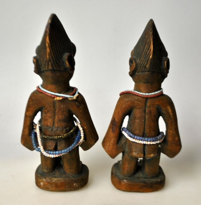 Par træfiguer, mand og kvinde, 20. årh. Nigeria. Med perlekæder rundt om livet og halsen. H.: 18 cm.Hjembragt til Danmark af udstationeret dansk familie.