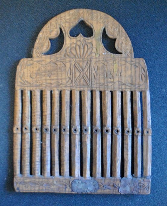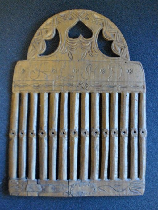 Antik dansk væve spjæld i bemalet bøg, 1811. Med karvsnit. Delvist bronzeret på en side. Med udskåret hjerte og intivalerne: A.L.H.D. 26 x 19 cm.Med forstærkninger af jern.