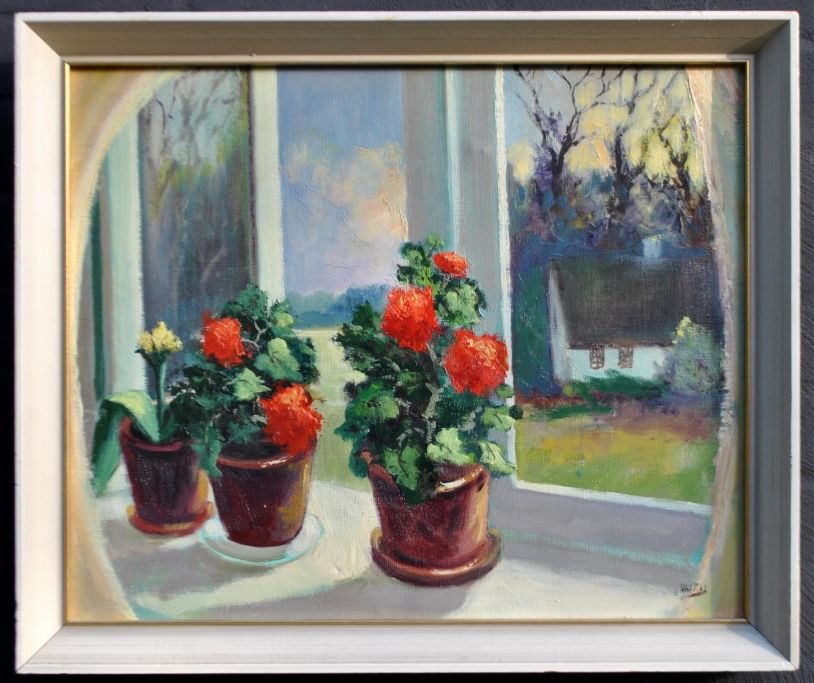 Pihl, Kaj (1894 - 1978) Danmark: Potteplanter i et vindue. Olie på lærred. Signeret. 42 x 52 cm.Indrammet: 47 x 57 cm.