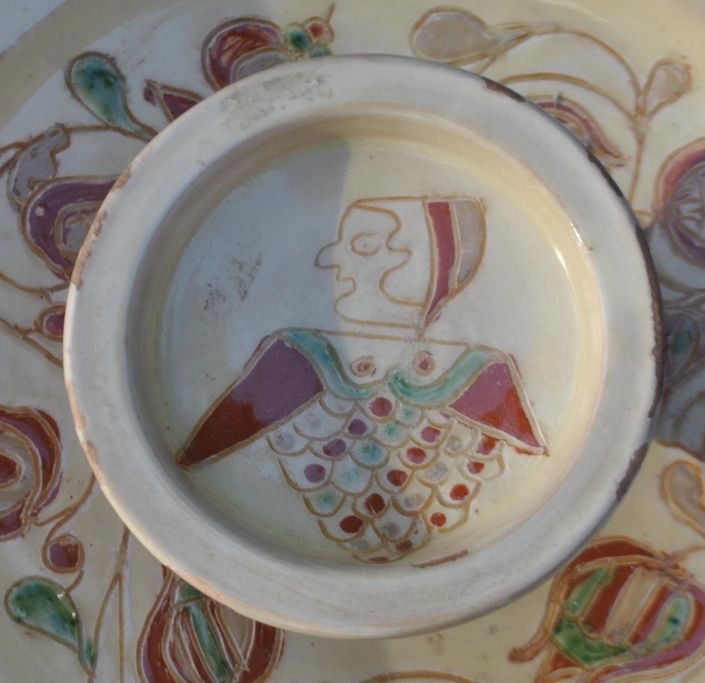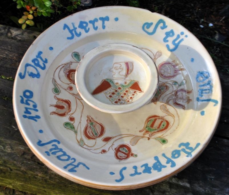 Nordtysk dobbelt fad, 20. årh. Lertøj med glasur og tekst. Kopi af ældre fad fra 1750. Signeret. H.: 7 cm. Dia.: 34 cm.Med mindre afskalninger og afslag!