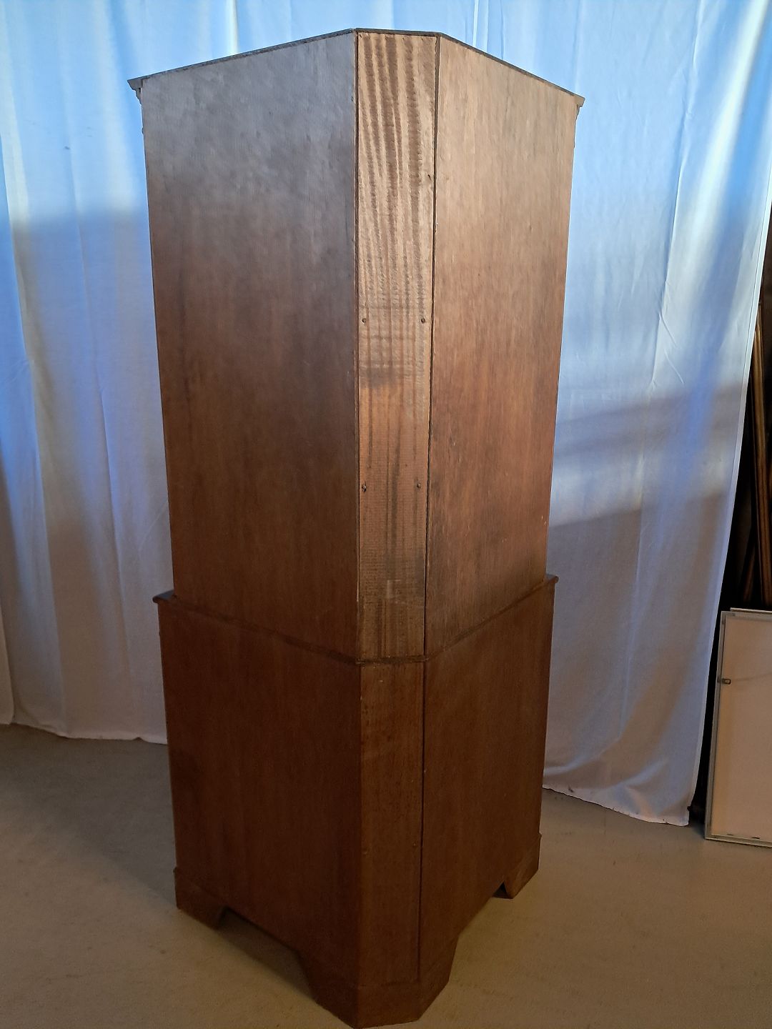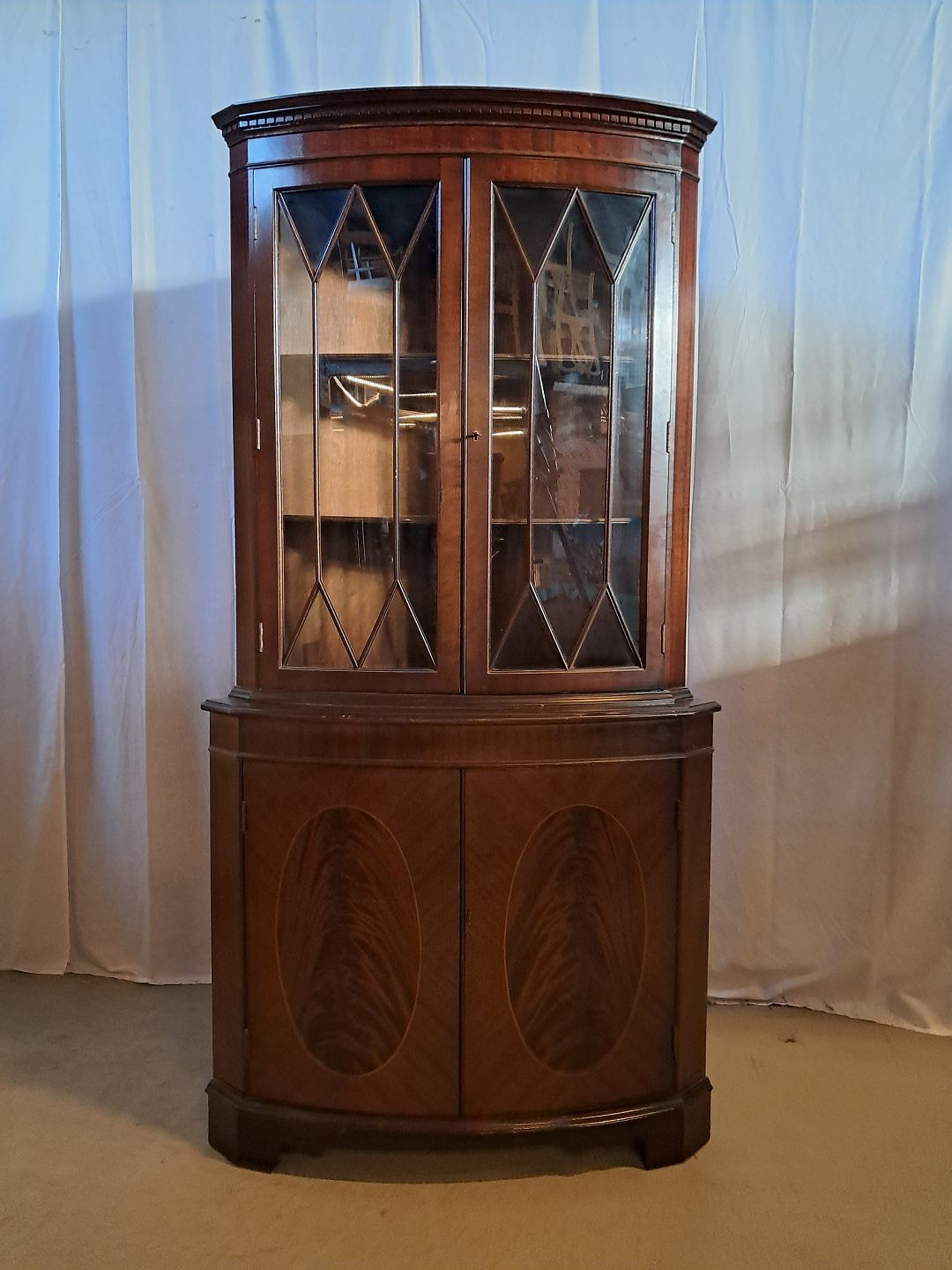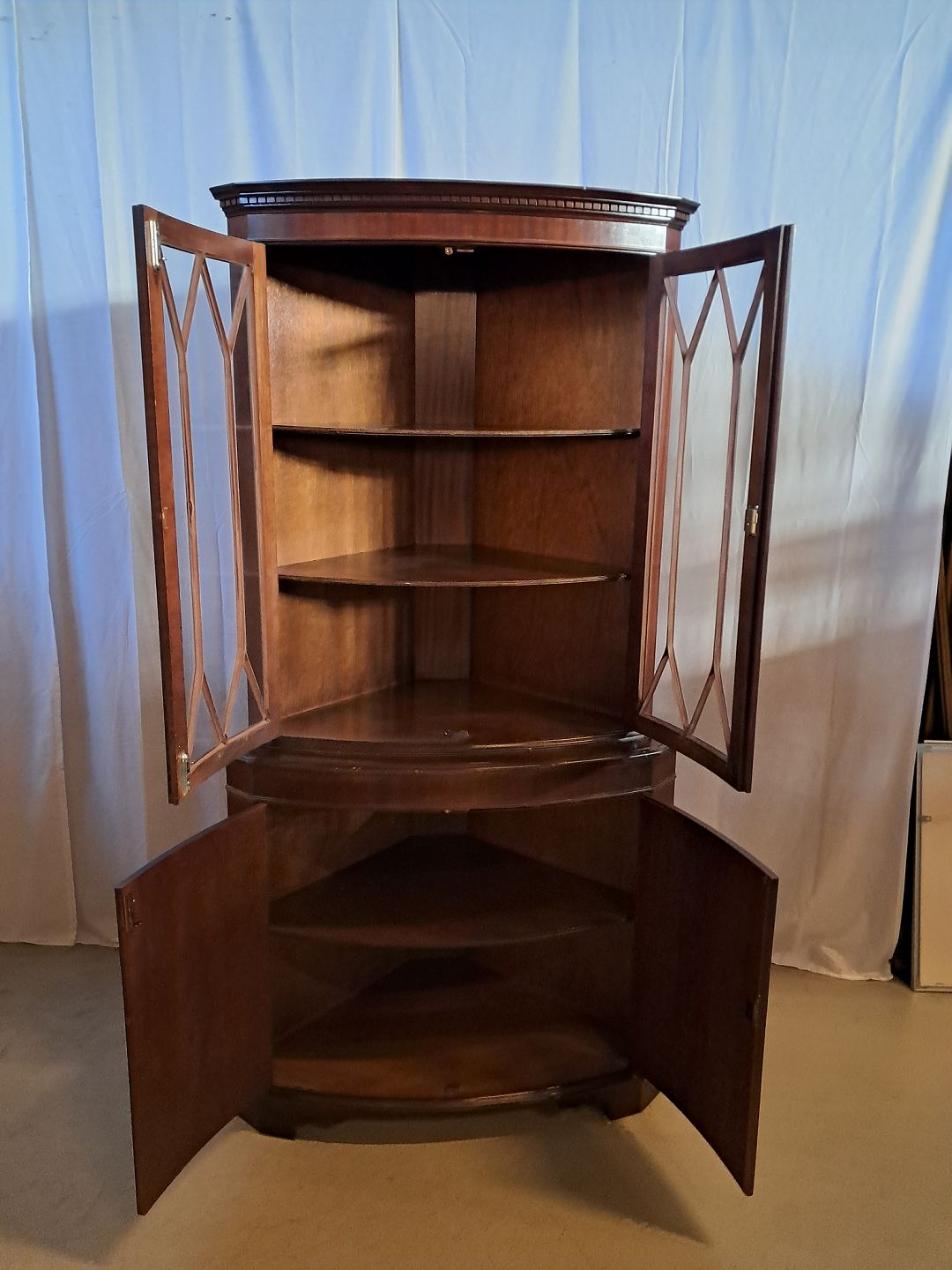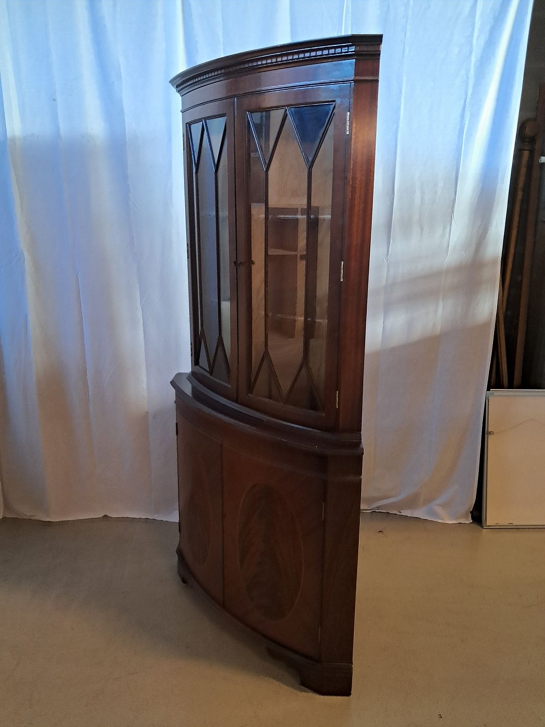 Hjørneskab i fineret mahogni, fra 1980erne.Det har brugsspor.