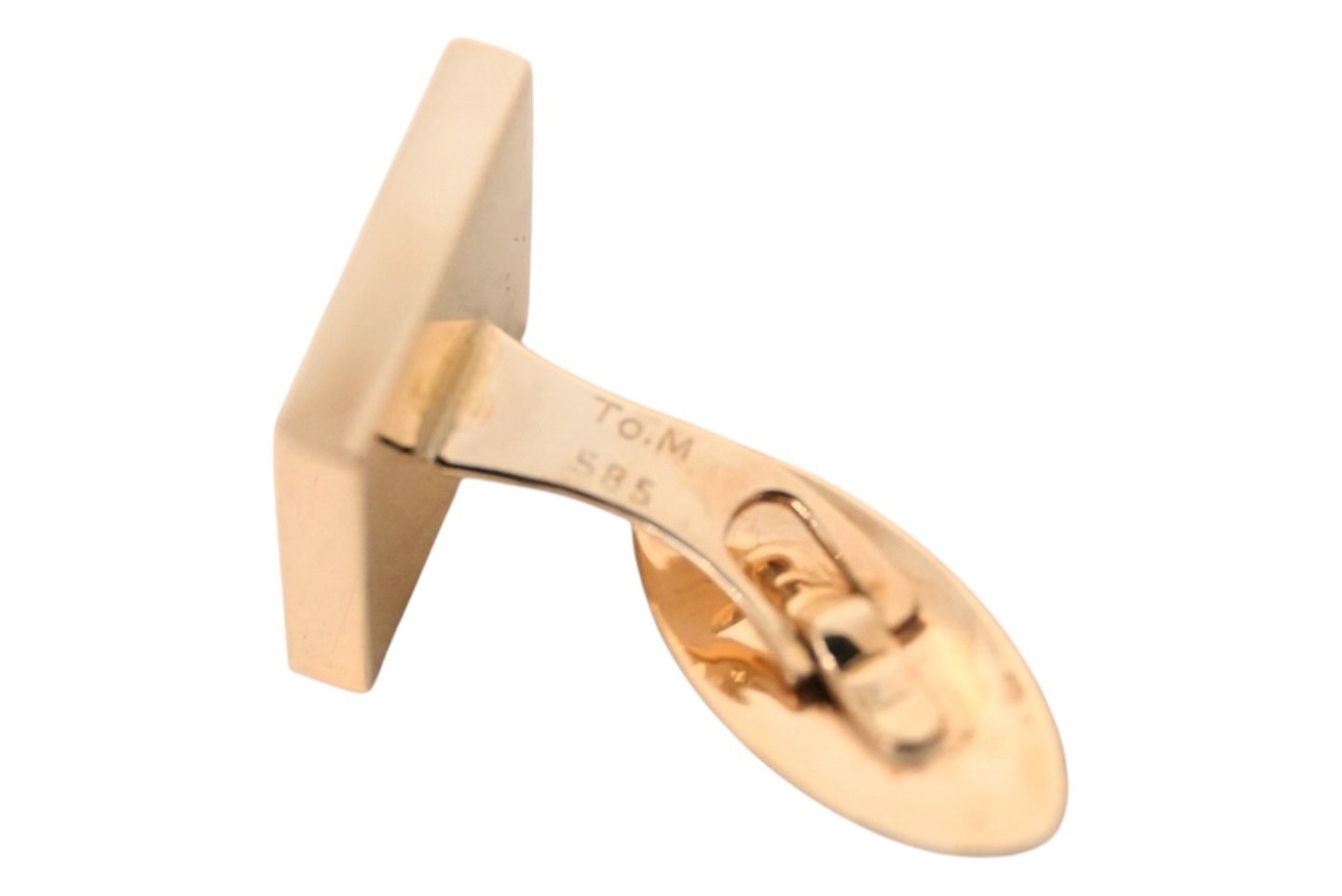 Tomo par manchetknapper i 14 karat guld i flot tung kvalitet og med mat overflade.Stemplet "To.M 585S". Tomo guld og sølv var sølvsmed i Hørsholm fra 1968 til 1988. Disse er fra ca. 1970 til 1980.