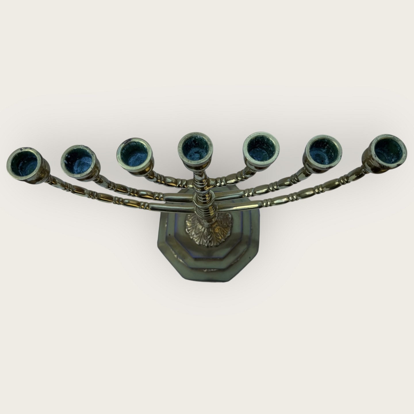 7 armet Messing lysestage, 33,5cm høj, 30,5cm bred *Pæn patineret stand*Lager: 1