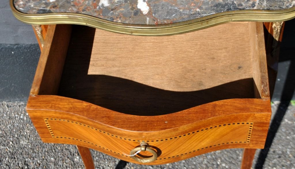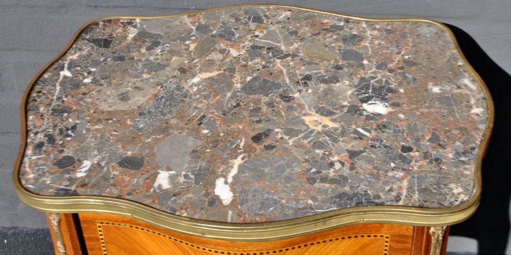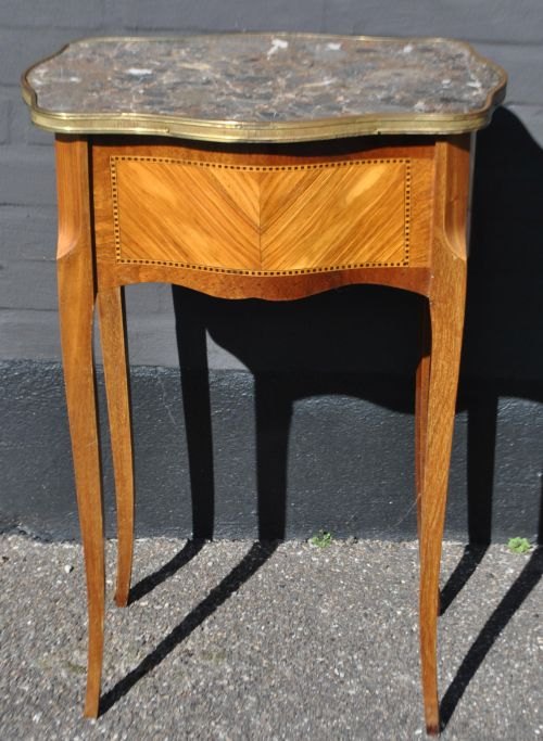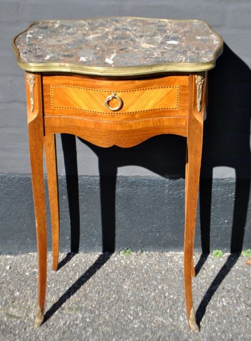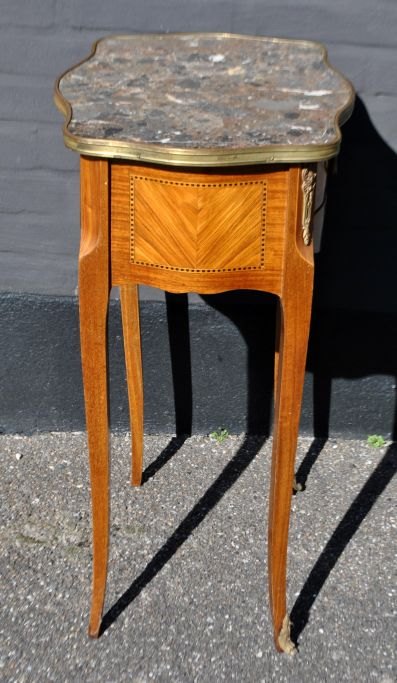 Fransk lampe bord, 20. årh. Med intarsia. Med messing kant og broget marmorplade. Med bronzesko. H,; 69 cm. B.: 47 cm. D.: 36 cm.Perfekt stand!