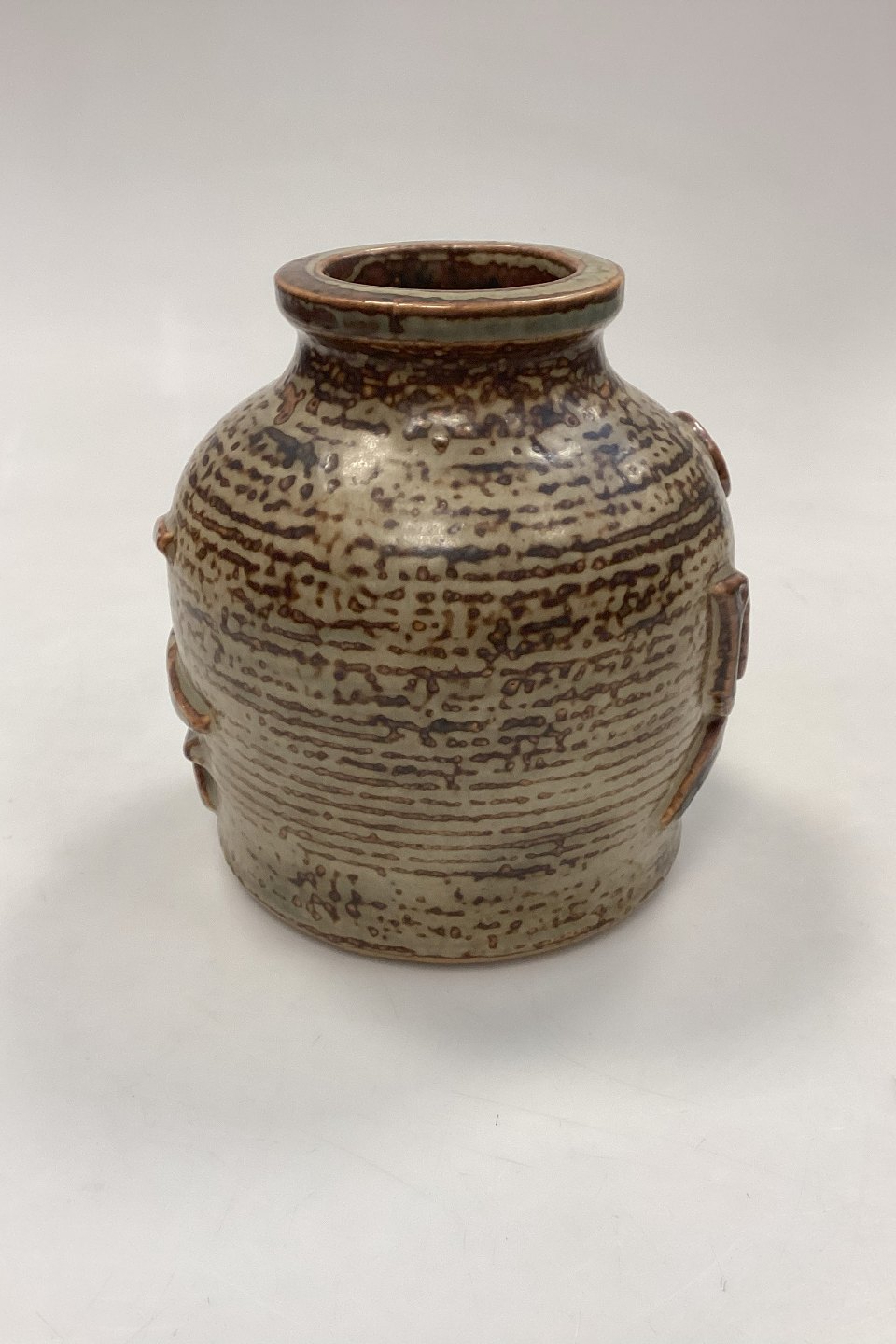 Royal Copenhagen Jørgen Mogensen Stentøjsvase No. 21484. Med fuglemotiver. Fremstår med brændingsrevne på kant /(se billede)Højde: 17 cm / 6.69 inch