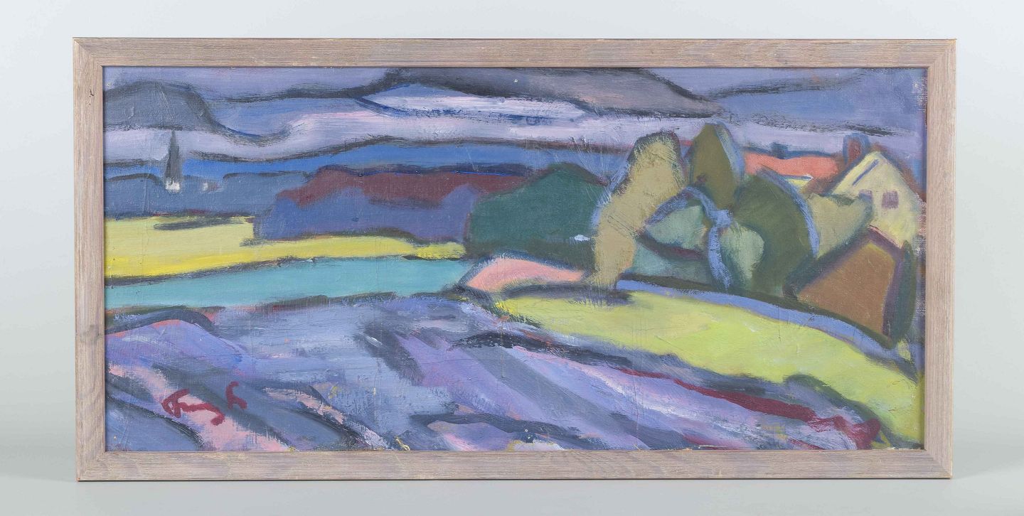 Et ekspressivt landskabsmaleri udført i en farverig og forenklet stil, hvor blå og lilla toner dominerer forgrunden, mens grønne og gule flader antyder marker og bevoksning. Maleriet bærer præg af en kraftfuld penselføring og en næsten abstrakt opbygning, hvor naturens former opløses i rytmiske farvefelter.