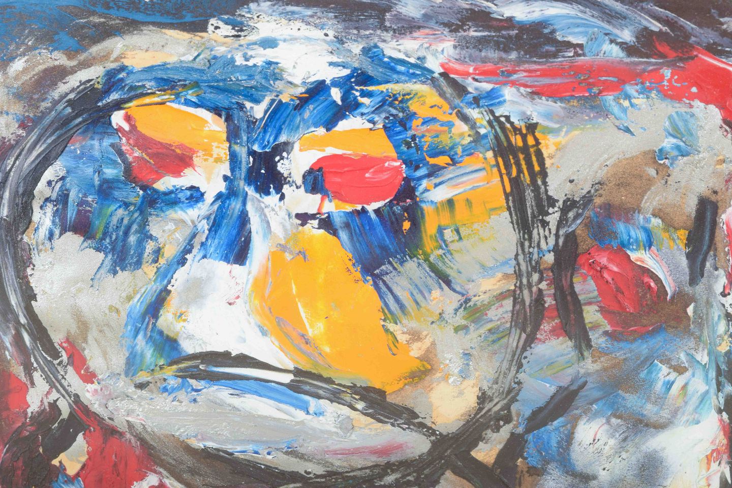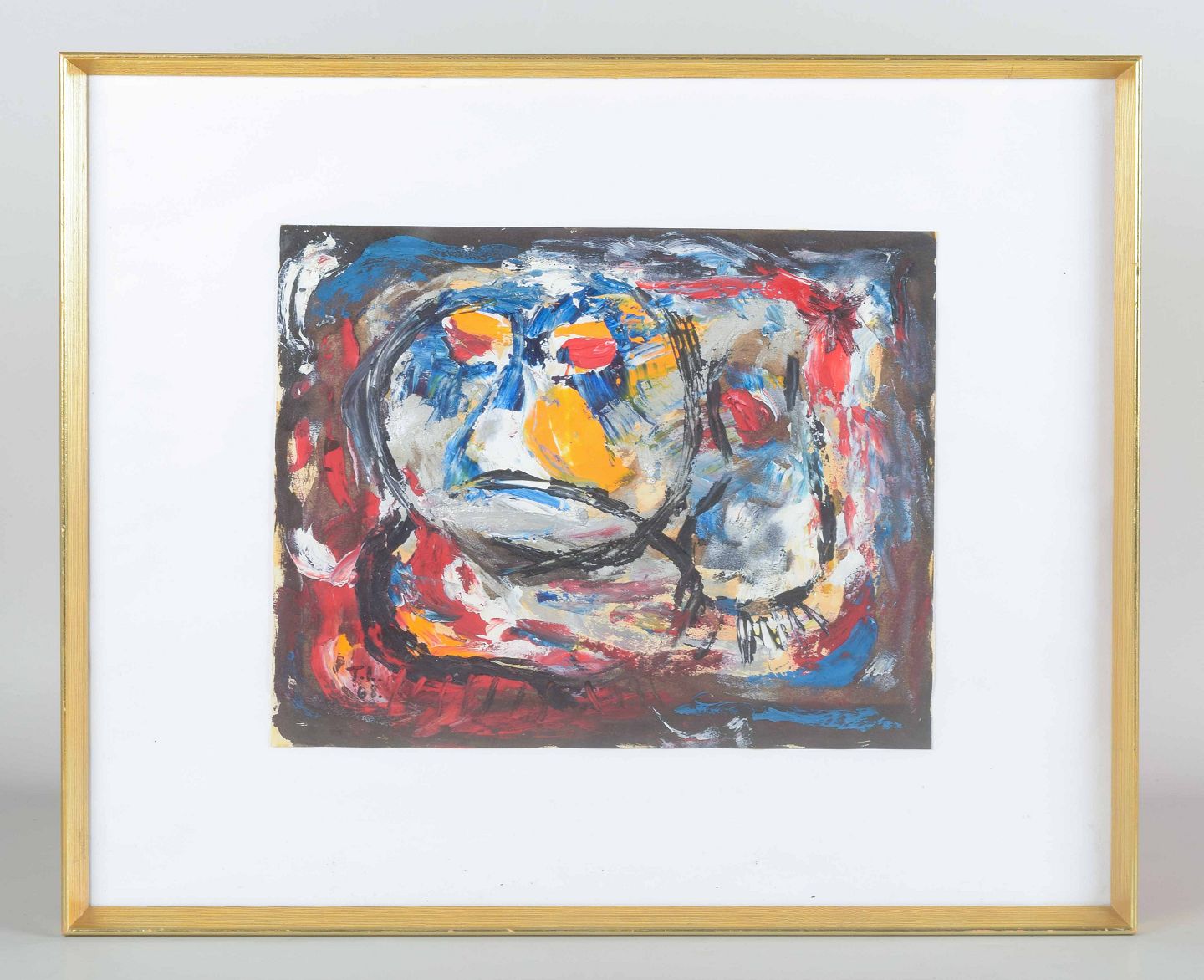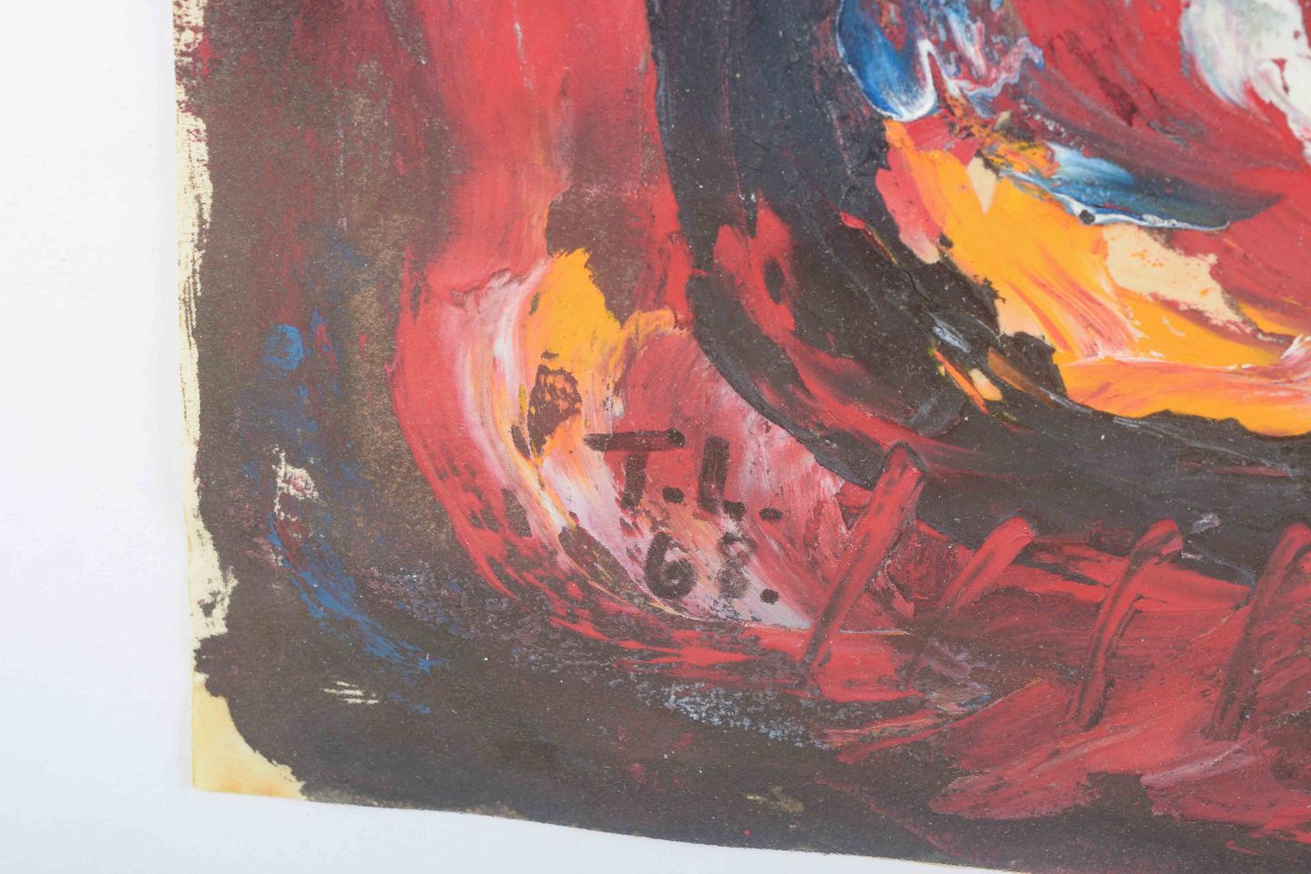 Et ekspressivt værk af Tom Lindhardt med kraftige penselstrøg og intense farver i blå, rød, gul og sort. Værket er signeret og dateret “T.L. 68” i nederste venstre hjørne.