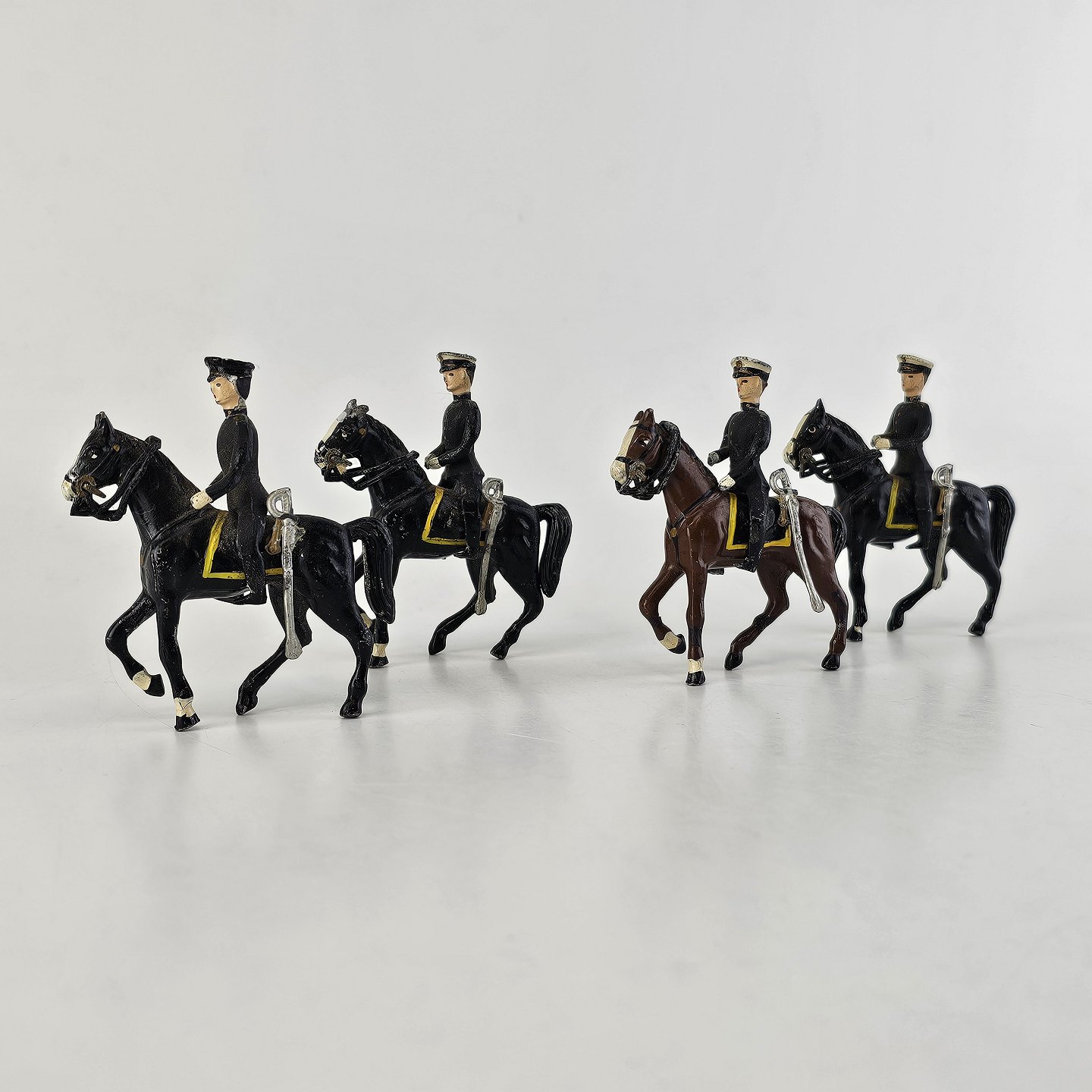 Fem figurer af politifolk i tin, én stående og fire til hest