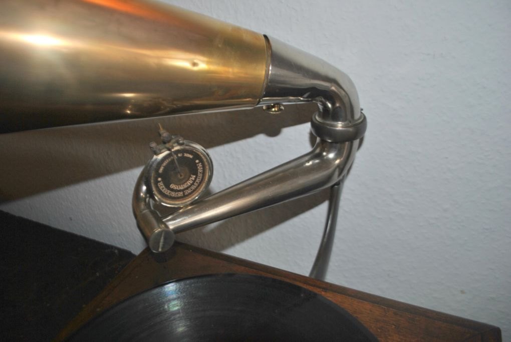 Original tragtgrammofon. ca. 1900. Maestrophone, Maestoso, His masters Voice. Til afspilning af 78' plader. Produceret i Schweiz. 37 x 37 cm. Tragt: L. 70 cm. Dia.: 42,5 cm.Flot stand! Kan spille!