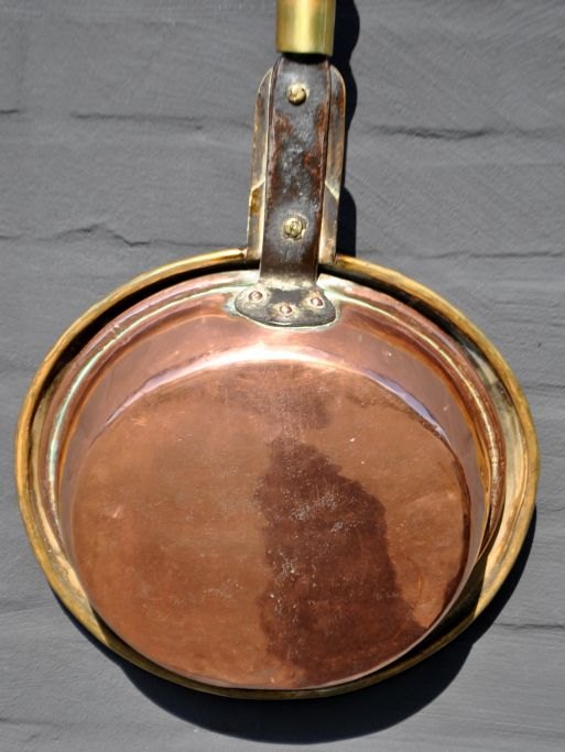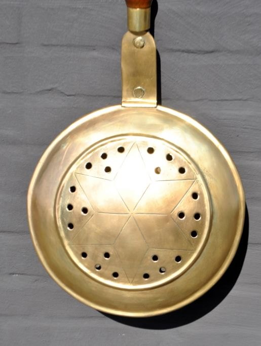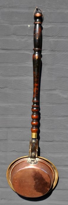 Varmebækken i kobber og messing, 19. årh. Messinglåg dekoreret med stjerne. Messinglåg er nyere end bunden. Skaft af træ. Stemplet. L: 100 cm. Dia: 29 cm.Emne nummer: 28301