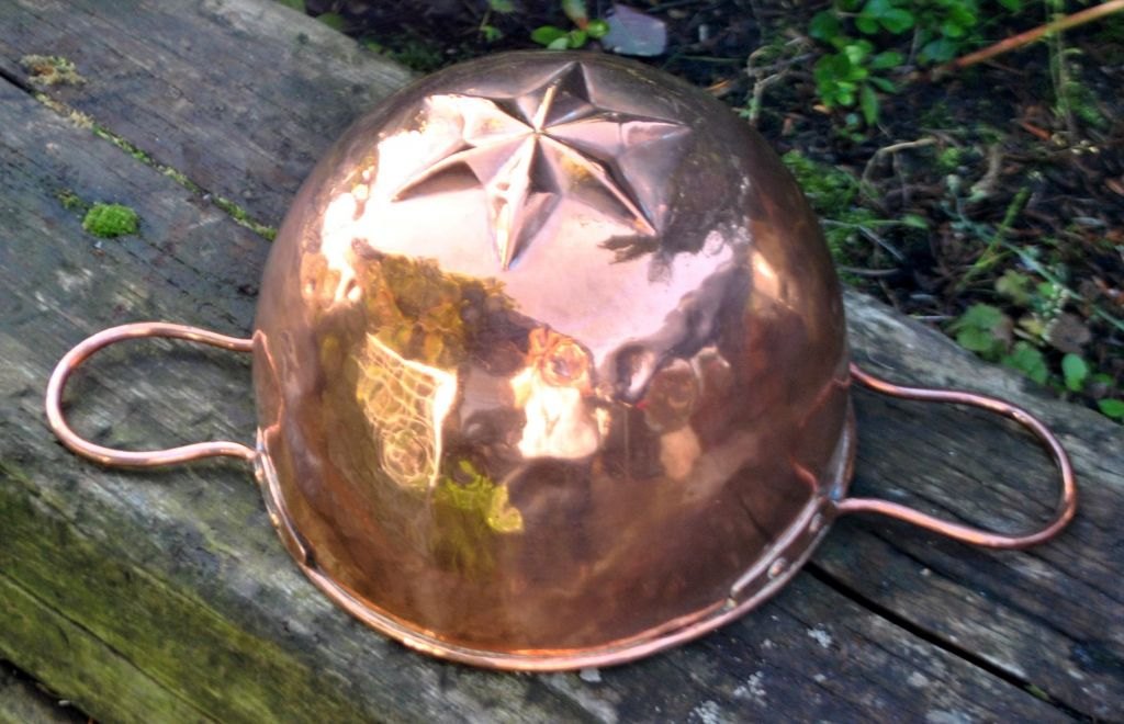 Postej eller kødform, kobber, 19. årh. Danmark. Med to hanke og dekoration i form af stjerne. Dia: 21,5 cm. Dia. inkl. hanke: 37,5 cm. H: 14 cm. Ingen synlige stempler.Emne nummer: 28306