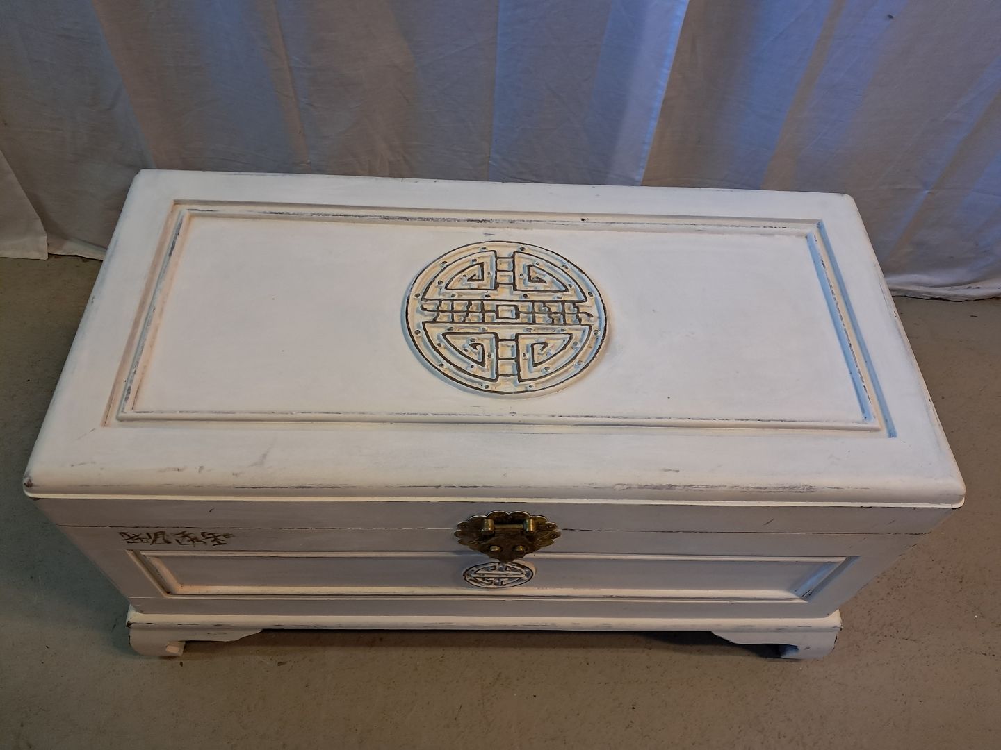Malet kiste i kamfertræ, fra 1970erne.Den har brugsspor.