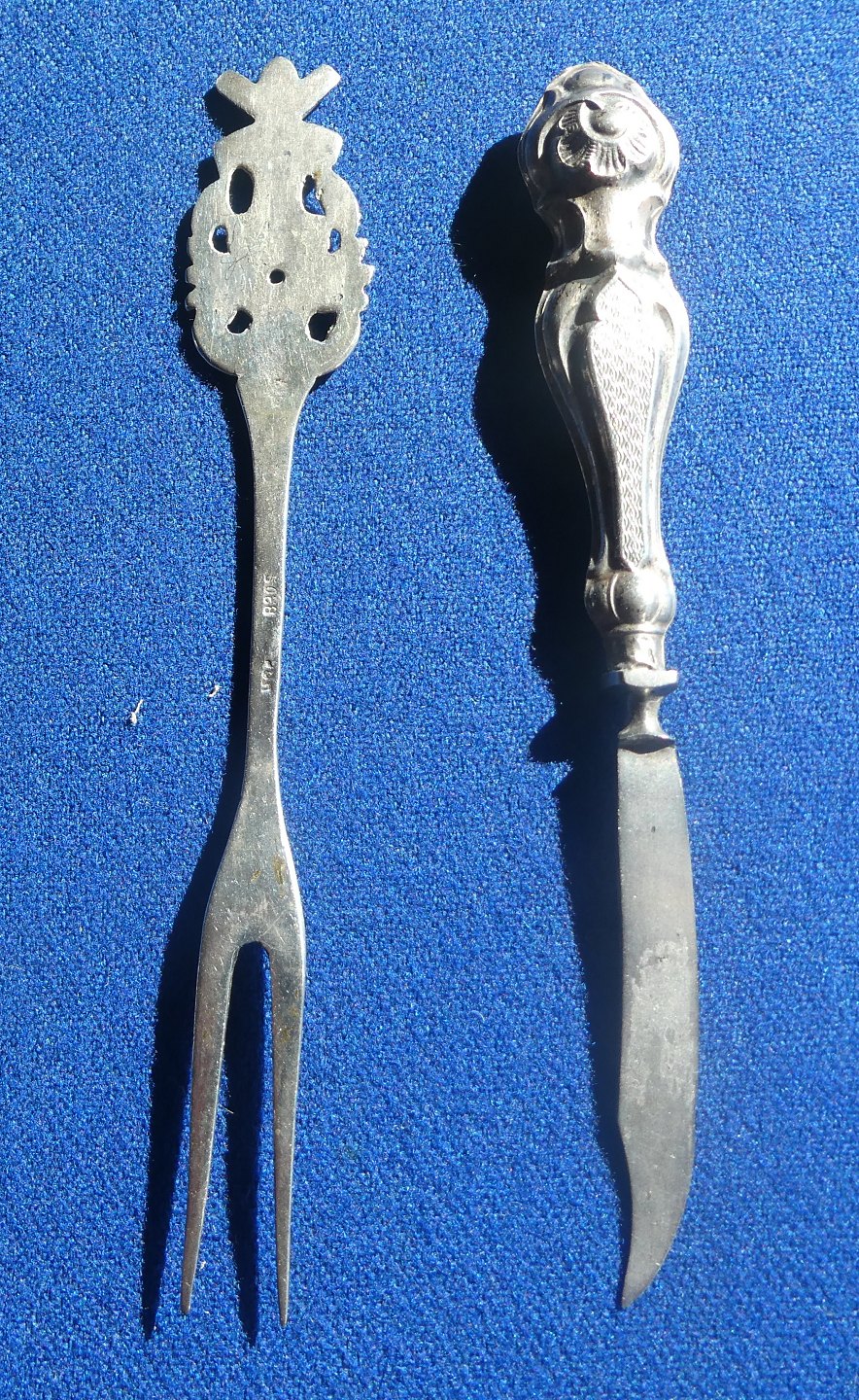 2 dele bestik til f.ex. oliven.Gaffel 11,5cm i 830 sølv og kniv 10,5cm uden stempler.