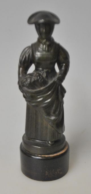 Andersen, Just (1884 - 1943) Danmark: Danske nationaldragter. Kvinde fra Dannevirke. H.: 13 cm. Stemplet.Diskometal. Fastgjort på sokkel af sortpoleret træ.