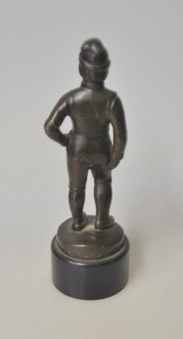 Andersen, Just (1884 - 1943) Danmark: Danske nationaldragter. Mand fra Mors. H.: 13,5 cm. Stemplet.Diskometal. Fastgjort på sokkel af sortpoleret træ.