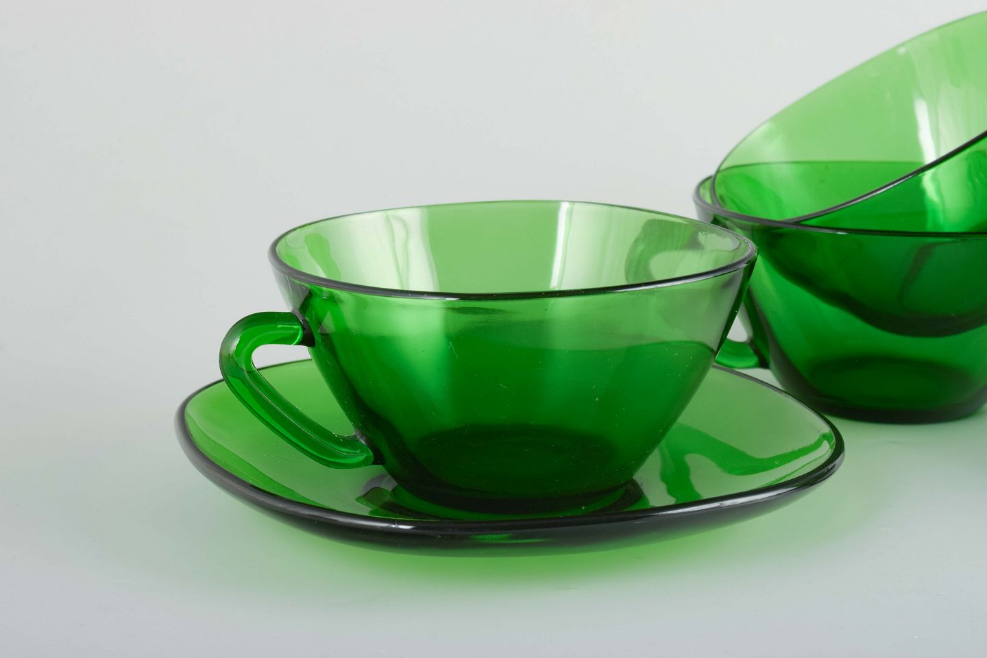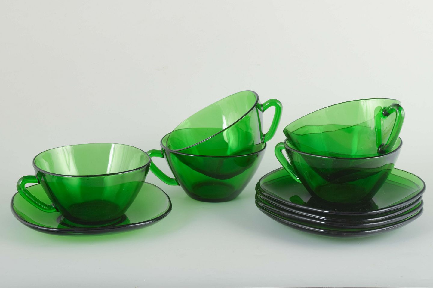 Vereco, 5 tekopper med underkopper, 1970/80’erne.Sæt med fem grønne tekopper i presset glas med tilhørende underkopper.