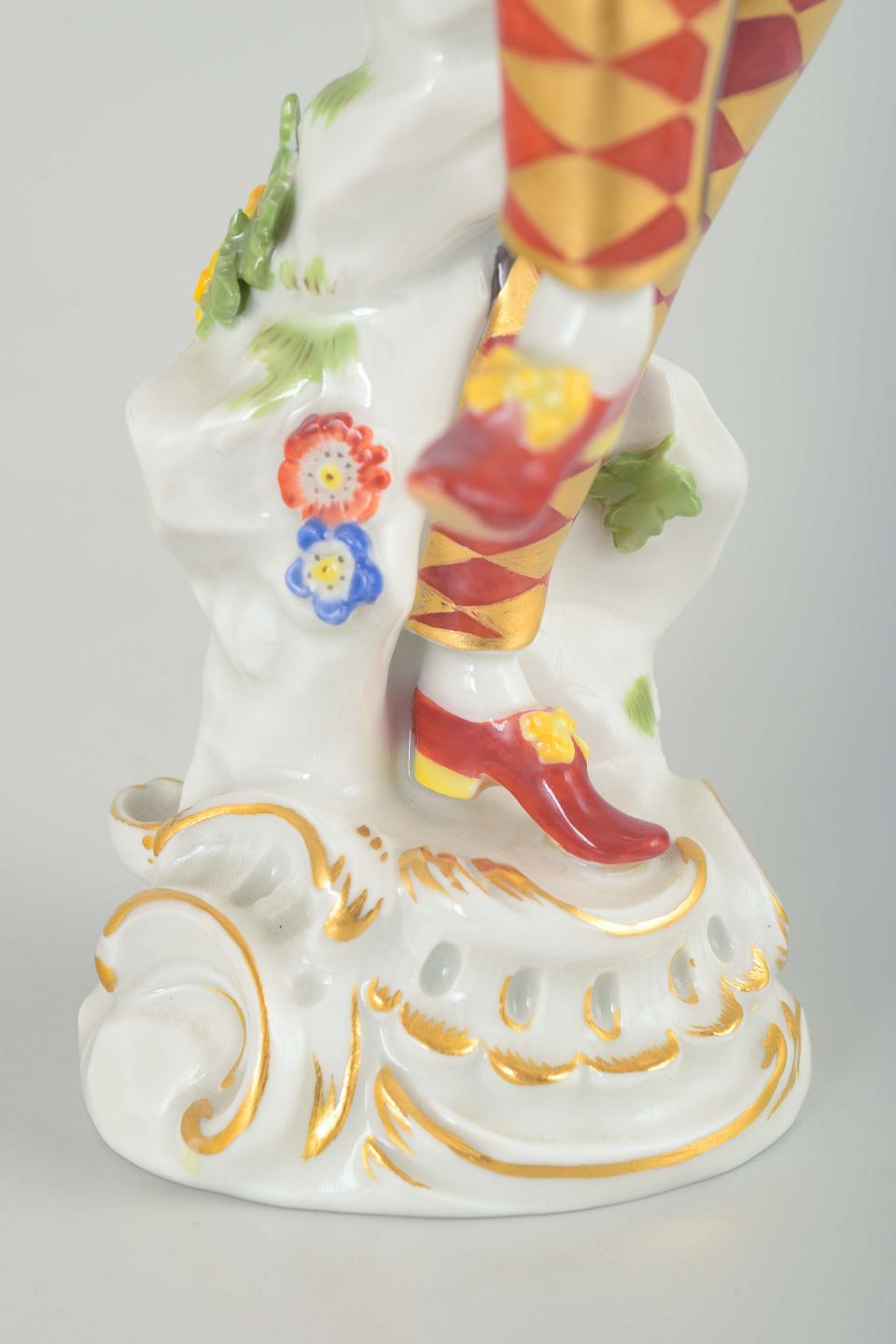 Meissen er verdens ældste og mest prestigefyldte porcelænsfabrik, grundlagt i 1710 under protektion af August den Stærke. Figuren af Harlekin er en hyldest til den populære italienske Commedia dell’arte-tradition, som har inspireret europæisk kunst og teater siden 1600-tallet. De livlige farver, dramatiske positurer og den overdådige udsmykning gør figurerne til ikoniske samlerobjekter.