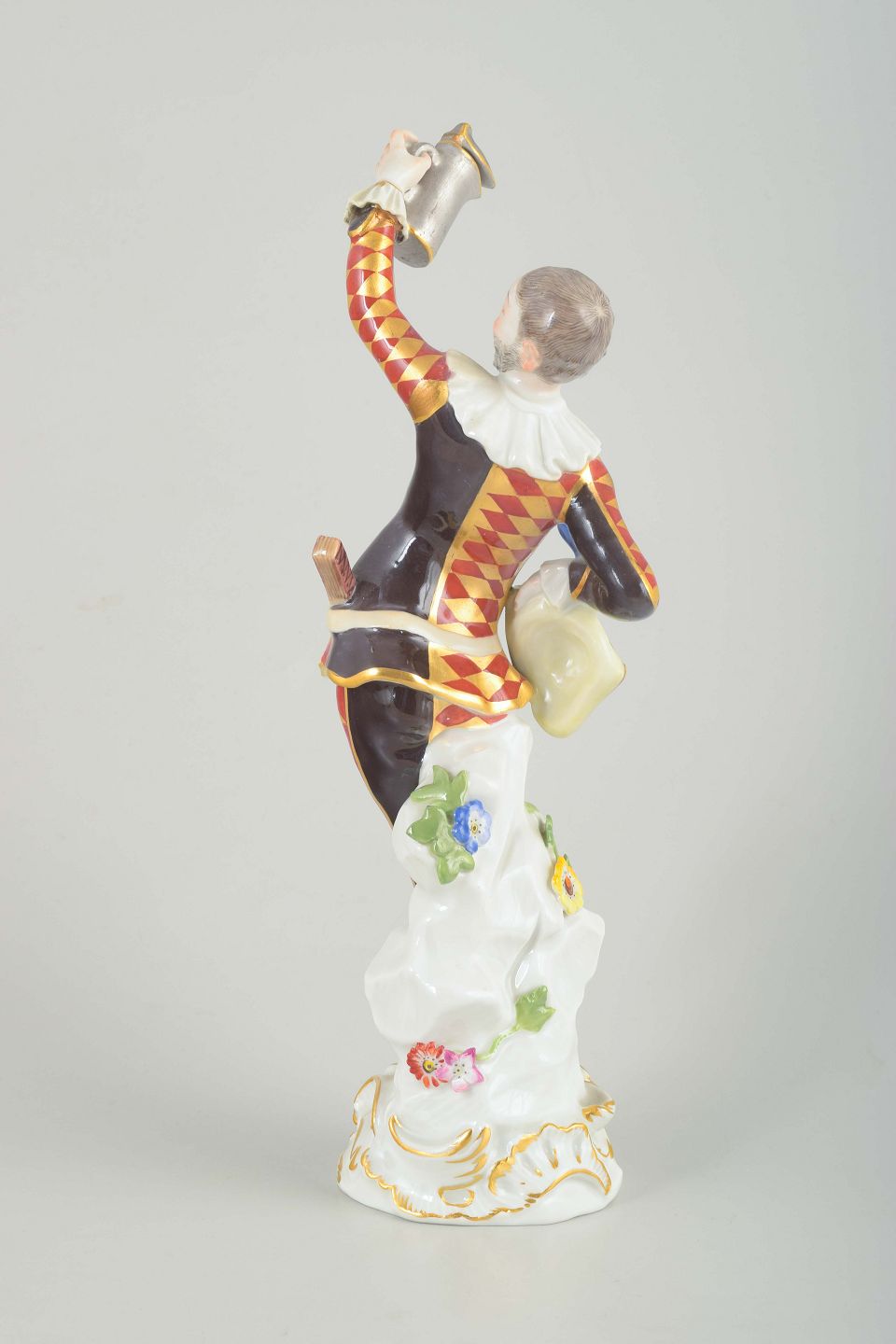 Meissen Porcelænsfigur “Harlekin”.Pragtfuld og detaljerig porcelænsfigur af Harlekin i klassisk Commedia dell’arte-dragt, udført i de fineste farver med overdådig håndmalet staffering i rødt, guld og sort. Figuren skildrer Harlekin i festlig positur med løftet krus, rigt dekoreret med gulddetaljer og stående på en rokoko-inspireret base med blomster.