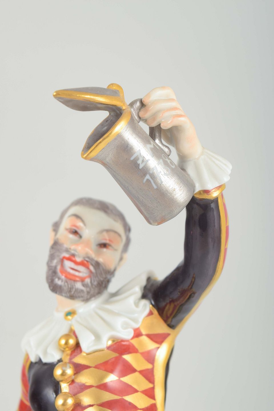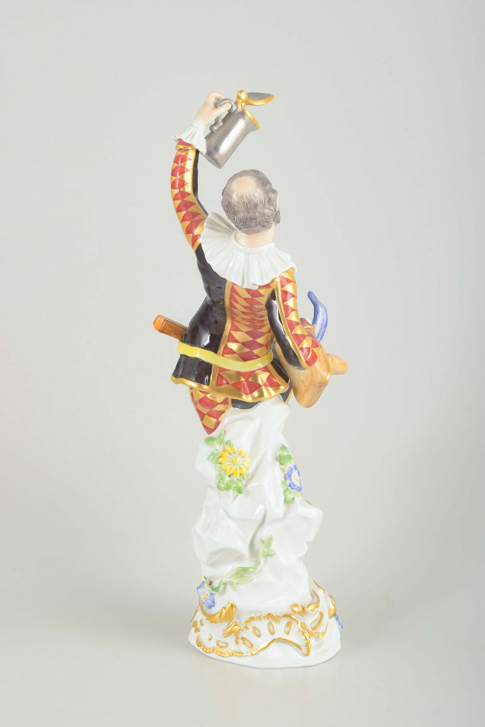 Meissen Porcelænsfigur “Harlekin”.Pragtfuld og detaljerig porcelænsfigur af Harlekin i klassisk Commedia dell’arte-dragt, udført i de fineste farver med overdådig håndmalet staffering i rødt, guld og sort. Figuren skildrer Harlekin i festlig positur med løftet krus, rigt dekoreret med gulddetaljer og stående på en rokoko-inspireret base med blomster.