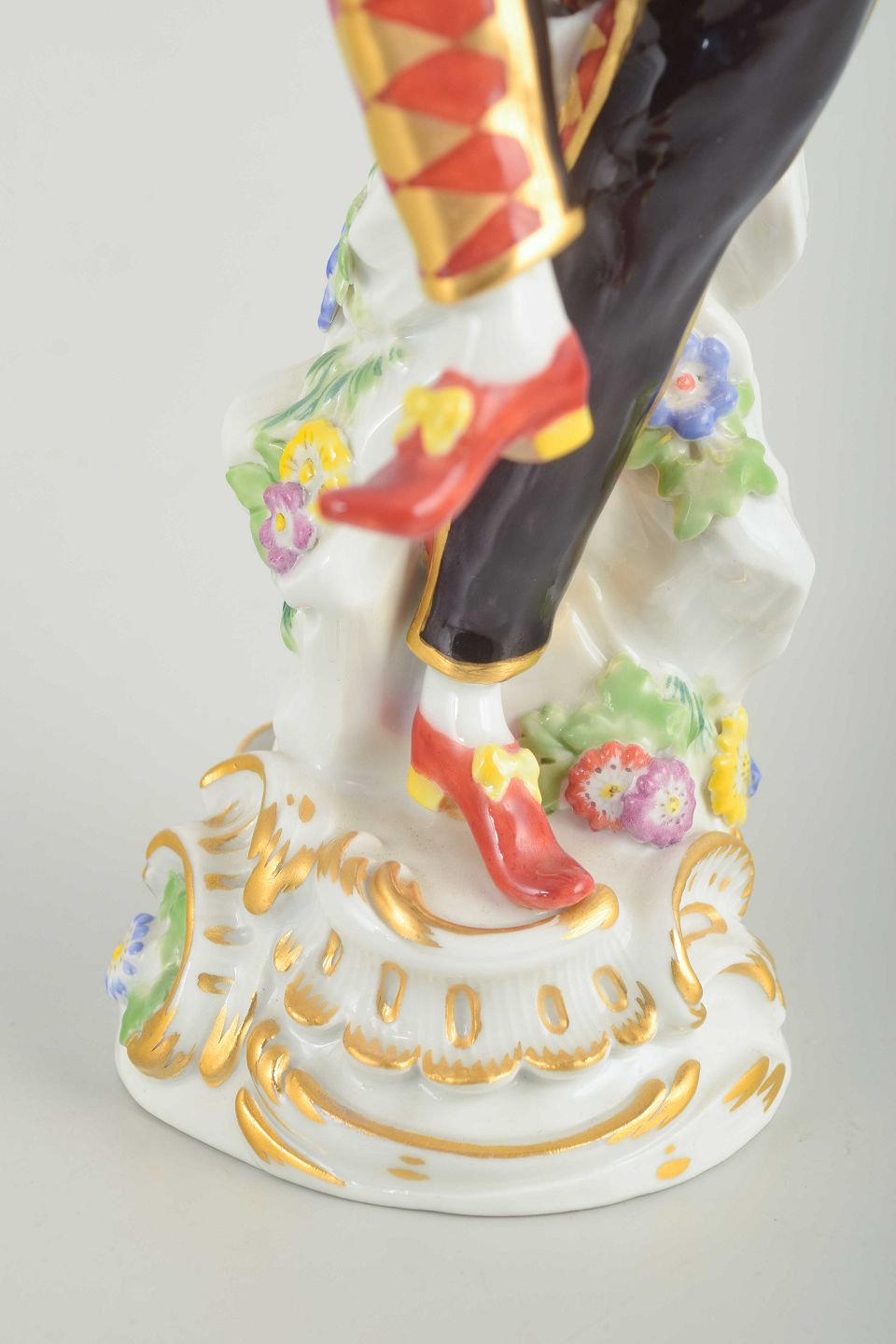 Meissen er verdens ældste og mest prestigefyldte porcelænsfabrik, grundlagt i 1710 under protektion af August den Stærke. Figuren af Harlekin er en hyldest til den populære italienske Commedia dell’arte-tradition, som har inspireret europæisk kunst og teater siden 1600-tallet. De livlige farver, dramatiske positurer og den overdådige udsmykning gør figurerne til ikoniske samlerobjekter.