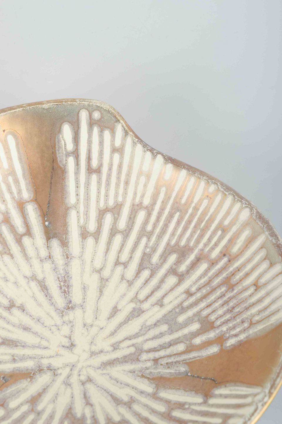 Drejet stentøjsskål med organisk form. Indvendigt dekoreret med stråleformet mønster i hvide og gyldne glasurtoner på lys brun bund. Udvendigt mørk, næsten sort glasur.