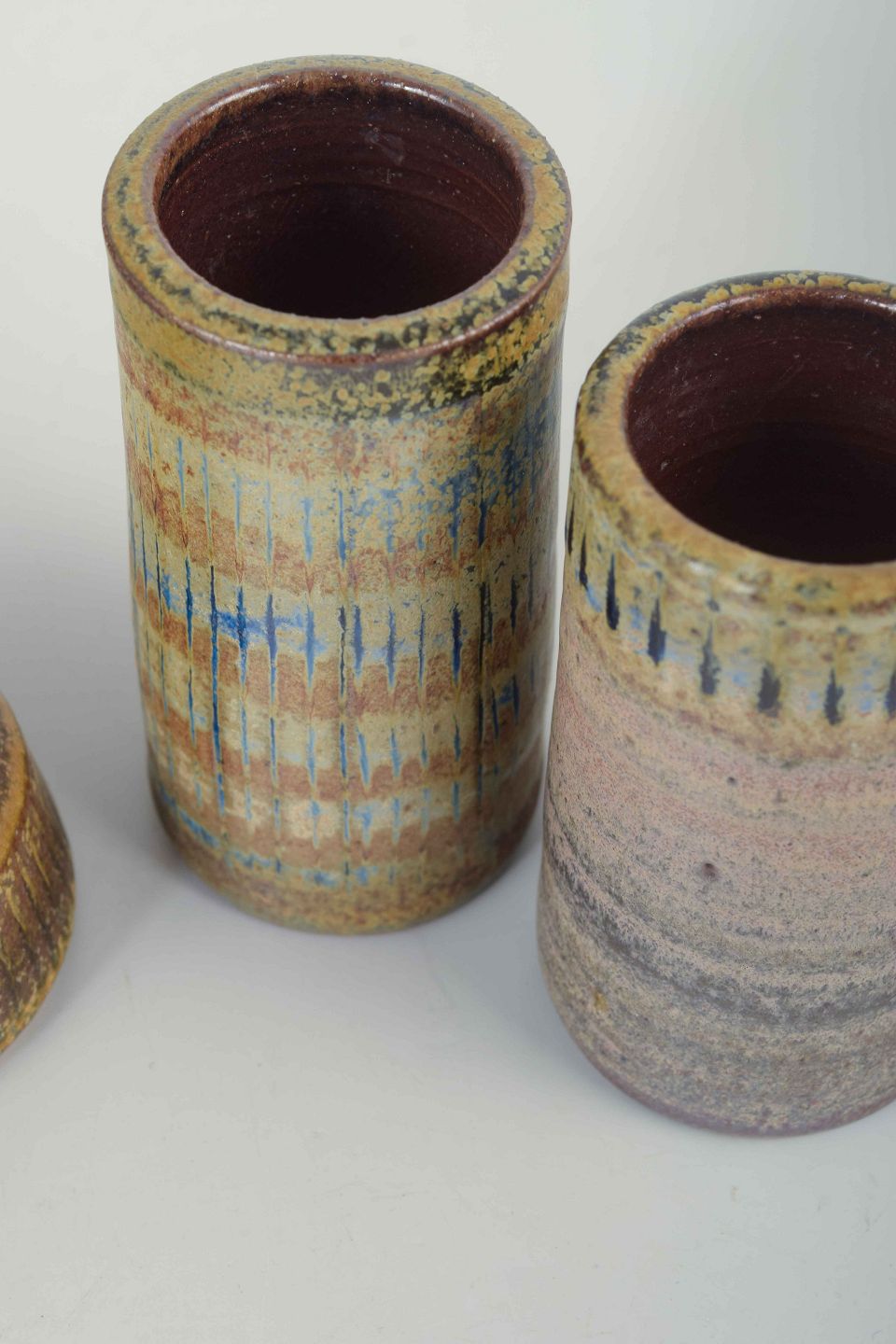 Tre hånddrejede stentøjsvaser – to cylindriske og én lavere, organisk formet. Dekoreret i flerfarvede glasurer i grønne, blå, lilla og jordfarvede nuancer.